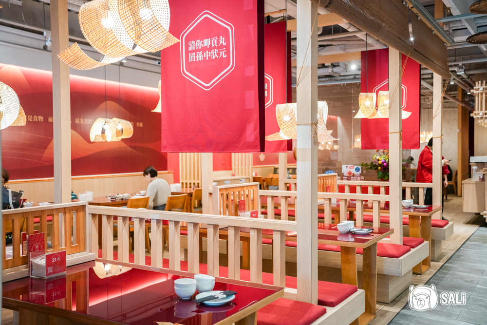 時髦台味空間,在大紅喜氣與木質暖意間優雅入座,新裝潢後的有春大墩店,以明亮的大紅色彩與淺色木頭,堆疊出熱鬧又溫柔的台式美學,寬敞座位搭配天花板錯落的竹編篩子燈飾,將懷舊元素演繹得既時髦又暖心,搭配逗趣的台語諺語,總能讓人邊吃飯邊會心一笑。