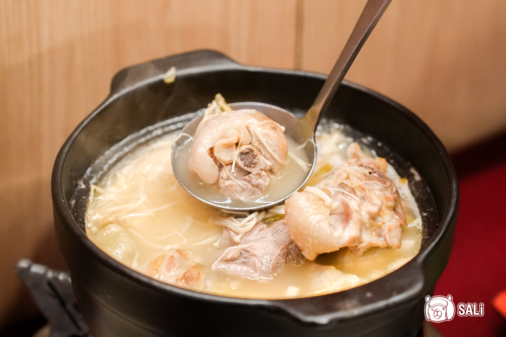 乳白湯頭集結豬腳、赤肉與老母雞慢火熬煮數小時,入喉滿是醇厚膠質,溫潤卻不膩口。最厲害是加入小米泡椒與酸菜提味,鹹香中帶點微酸辣,微微的辛辣讓湯頭更顯深度,風味超迷人,大塊帶骨雞肉軟嫩入味,還有吸飽湯汁的腐皮與白菜,餐後再來份清爽仙草凍收尾,這份暖胃又暖心的厚實感,讓人幸福感爆棚