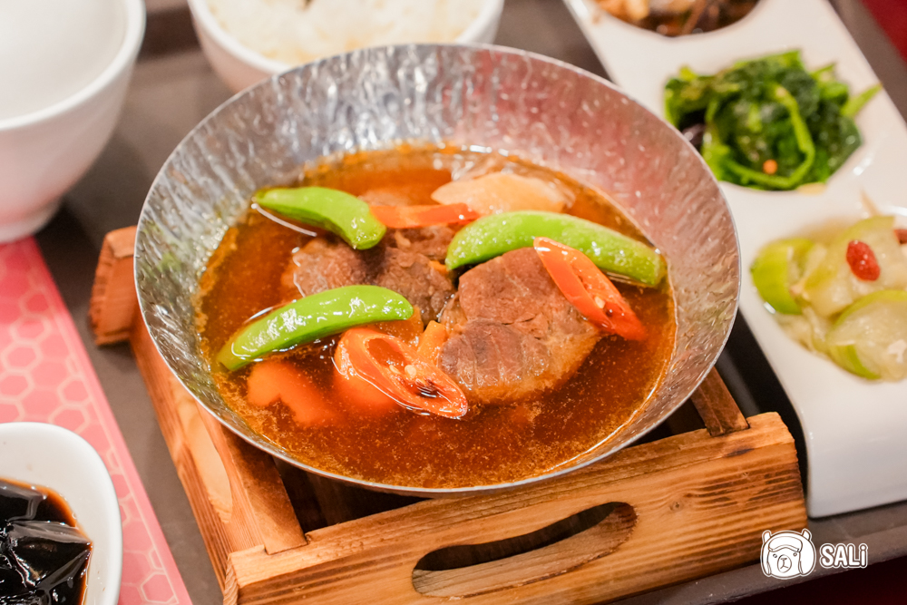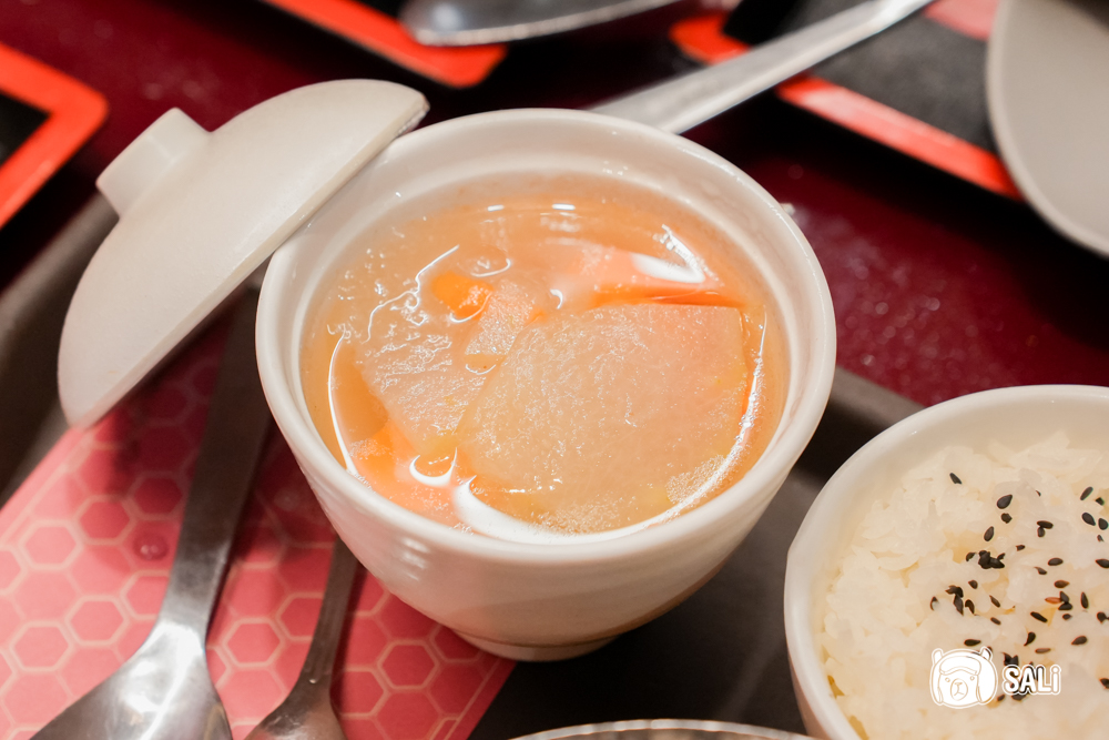 定食包含三款隨時令更迭的小菜與熱湯,平衡主餐的濃郁,最後再以冰涼仙草凍作結,整套吃完超滿足