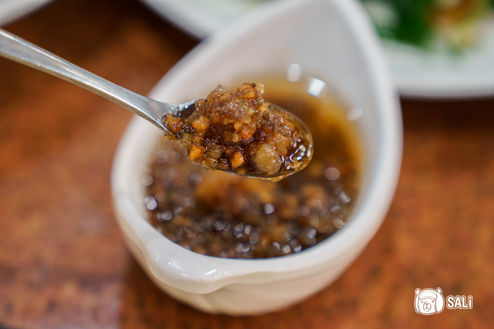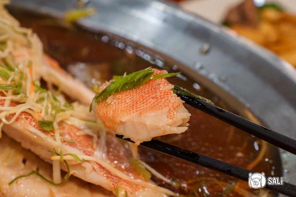 搭配蔥絲、薑絲一同入口,香氣更上一層,底層醬汁鹹香回甘,襯托出魚肉的清鮮,油脂適中吃起來爽口不膩,簡單清蒸就能把原始鮮味發揮到最好,完全是現流海鮮最迷人的吃法