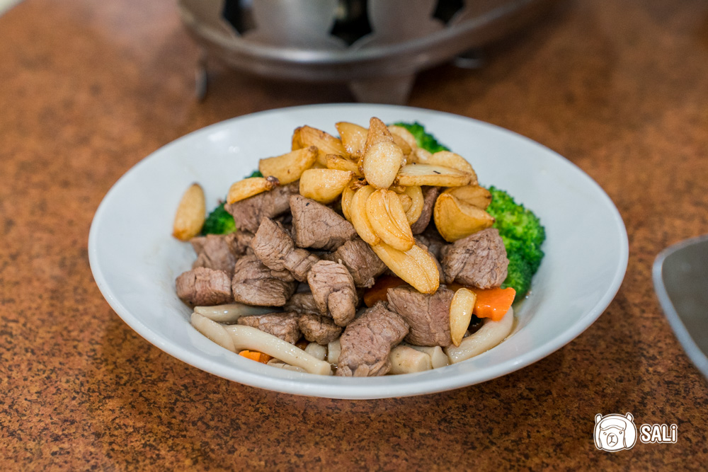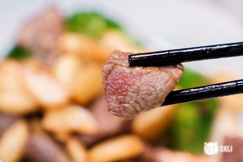 菲力先以蒜頭爆香,再用蒜油細煎牛肉,外層帶著金黃焦香,裡頭軟嫩多汁,上桌前切成骰子大小,一口一個剛剛好,入口時蒜香滿溢,伴隨牛肉的鮮甜,濃郁卻不膩口,愈嚼愈香