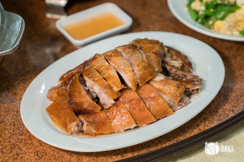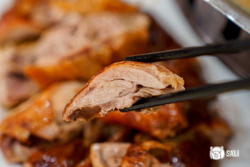 1/4隻的燒鵝份量就相當大,外皮薄脆不油,咬下去喀滋作響,裡頭肉質軟嫩多汁,鹹香中帶點甜味,單吃就已經夠迷人,搭配特調冰梅醬更是絕配,清爽解膩