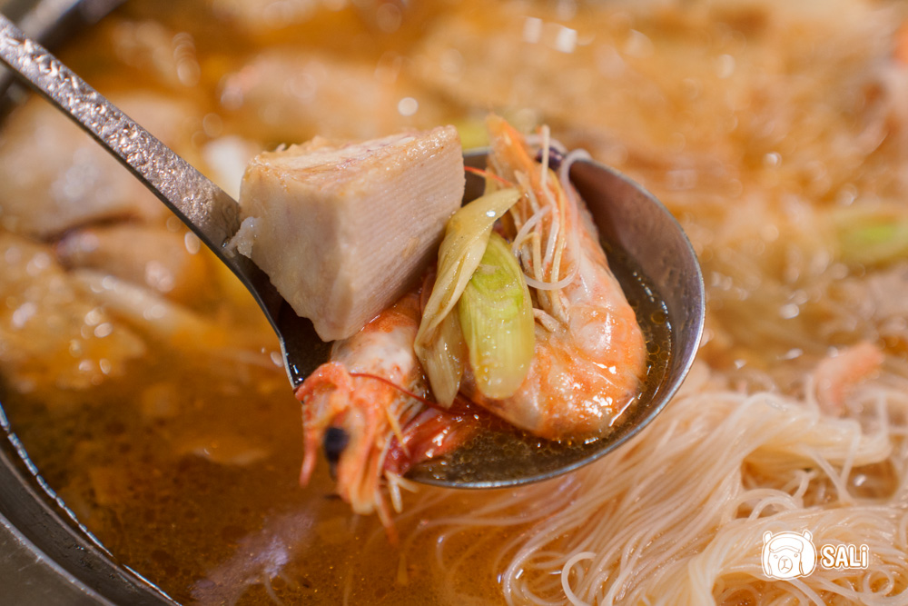這鍋米粉湯自帶古早味,先用櫻花蝦和大地魚爆香,再加入雞高湯細火慢熬,湯頭鮮甜厚實。鍋裡滿滿好料:中卷、鮮蝦、芋頭、豬五花、貢丸、豆皮通通有