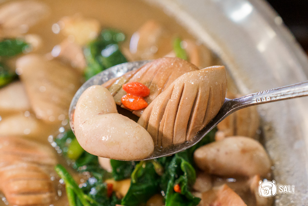 這道「麻油雙腰」以濃醇麻油和純米酒快炒,端上桌時香氣立刻撲鼻,雞佛與腰花處理得很乾淨,完全沒有絲毫腥味,入口軟嫩帶點脆彈,口感滑順帶勁