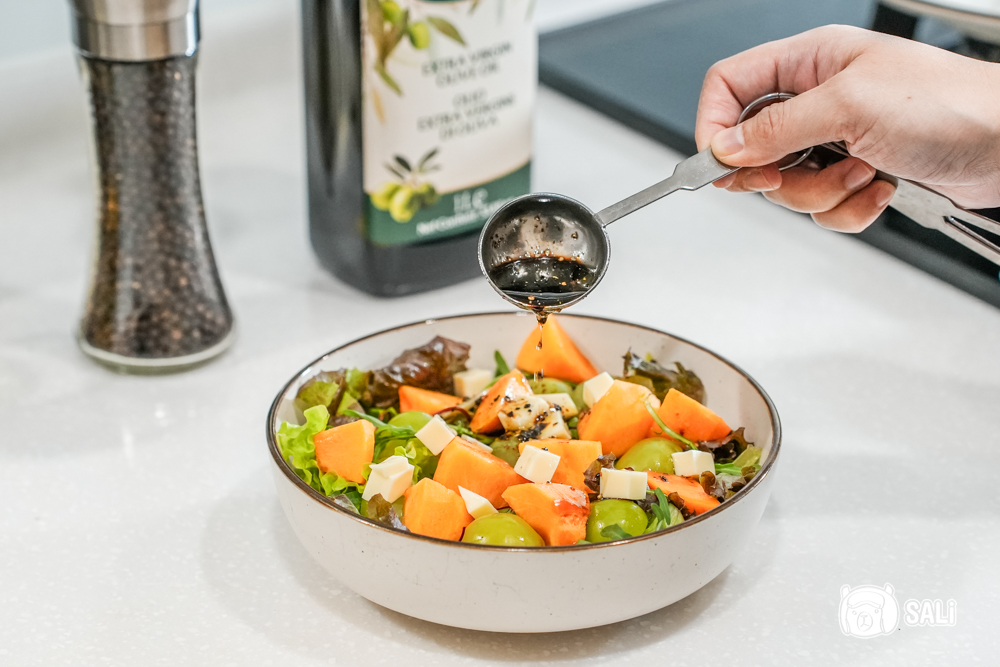這次油醋醬比例是 橄欖油 1.5 小匙+巴薩米克醋 1 小匙+黑胡椒少許,拌一拌就能用,真的零難度,這款DON FEDELE 特級初榨冷壓橄欖油 香氣馥郁質地純淨,搭配水果和生菜都很合拍,吃起來清爽沒負擔,好吃到我真的可以天天一盤