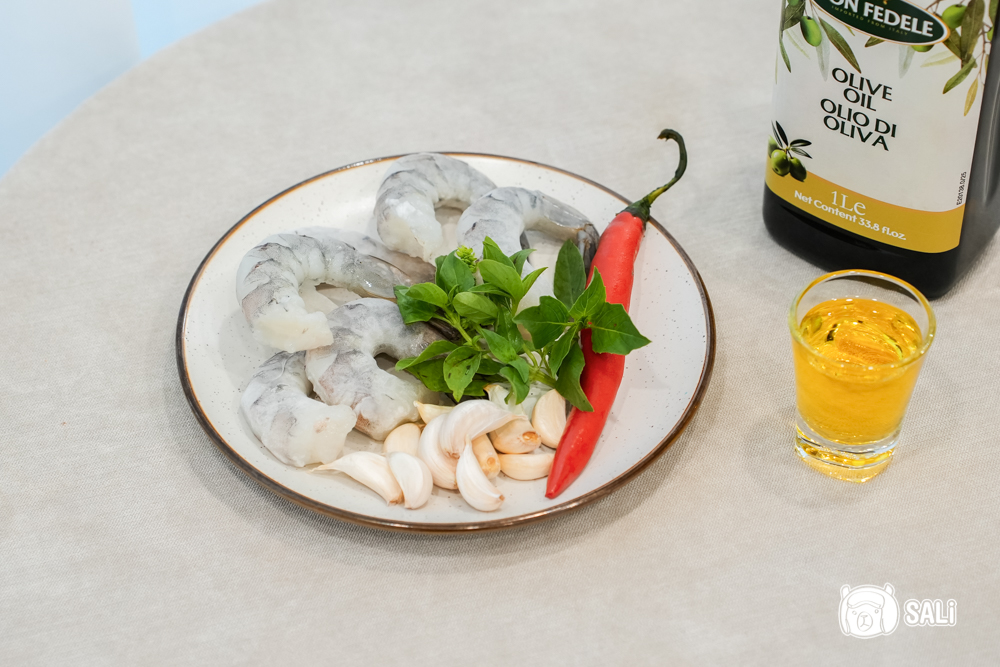 食材:DON FEDELE 純橄欖油、蝦仁或大蝦、蒜片、辣椒、九層塔、黑胡椒、鹽、法棍麵包