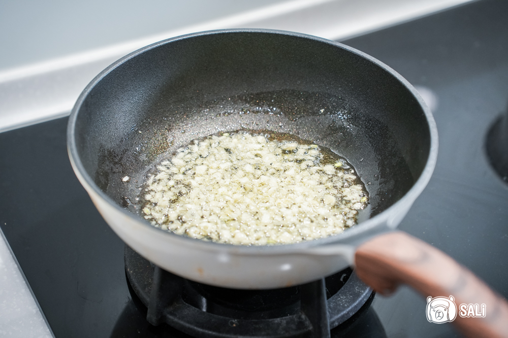 2. 鍋中倒入適量 DON FEDELE 純橄欖油,放入蒜粒,小火煮到微微上色