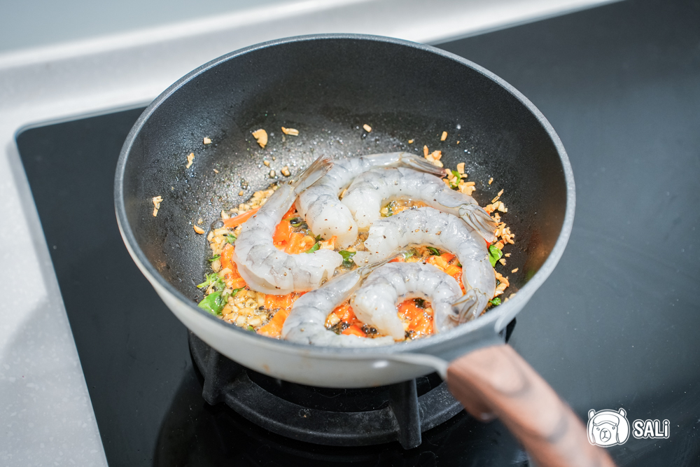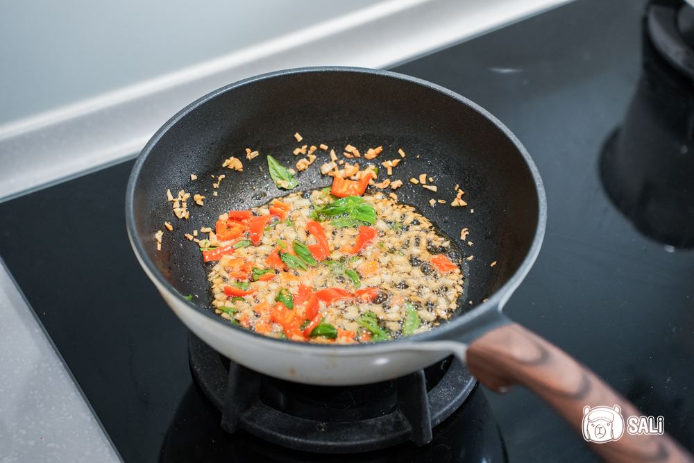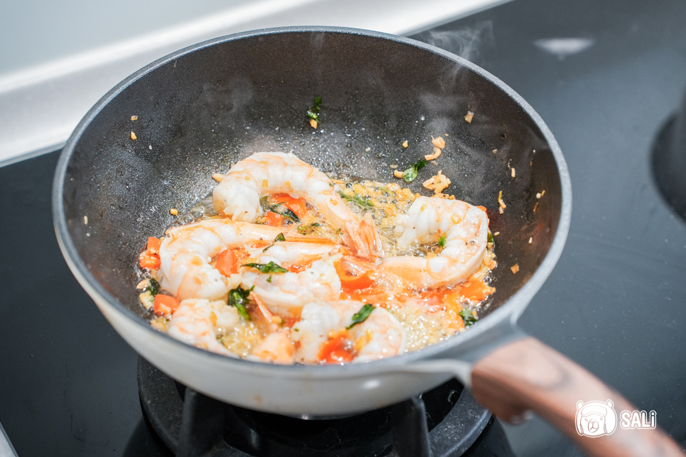 3. 再加入辣椒和九層塔稍微加熱,再放入蝦仁,關火拌一下後重新開火煮熟,記得蒜粒不要煮到焦掉