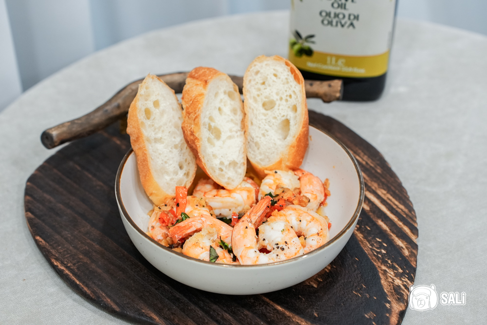 香氣比特級初榨冷壓橄欖油更內斂、油色也更透亮,果韻淡雅,整體成分乾淨,Omega 接近 7 成,同樣通過無農殘、無芥酸、無黃麴毒素檢驗,天天用都放心。這次我拿它做橄欖油蒜味蝦,香氣直接拉滿,下酒菜完全輕鬆上桌,尤其是法棍沾那鍋蒜香橄欖油,好吃到一定是大拇哥啦