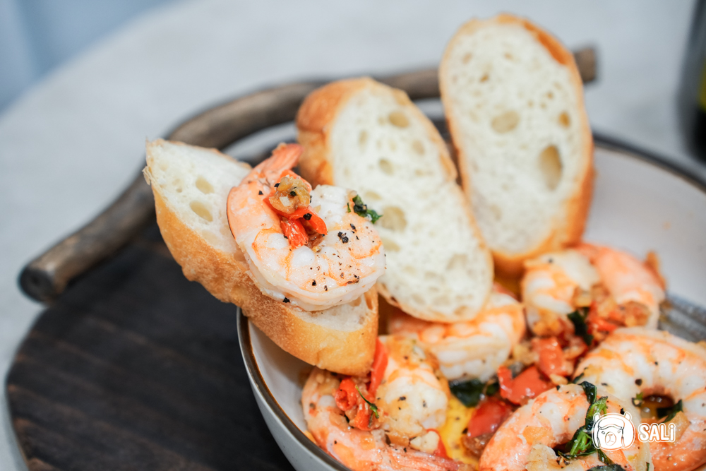 帶著一點辣意和九層塔的清香,蒜味在橄欖油裡被慢慢帶開,與彈嫩的蝦仁交織,味道非常順口!最犯規的還是那鍋蒜味橄欖油,法棍沾一下就能吸滿香氣,咬下的瞬間特別滿足,不管是當下午茶小點,或宵夜想吃點熱食,這盤端出來都會讓人想拍手叫好手叫好