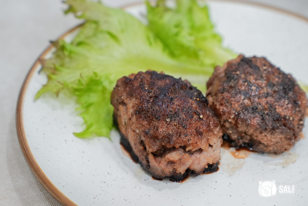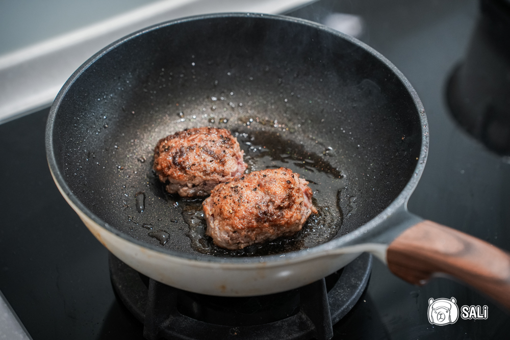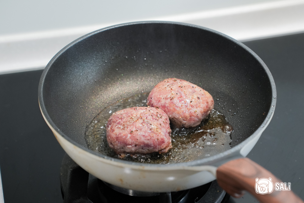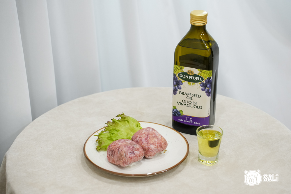 這次我把DON FEDELE 的葡萄籽油 拿來煎牛肉漢堡排,用的是現成、已調味好的冷藏漢堡排版本,基本上不需要再加料,只要把油熱好,把漢堡排輕放進鍋裡,等表面煎到帶一點棕色,再翻面續煎就行了,切記火候不用開大,小火慢煎更能保留肉汁