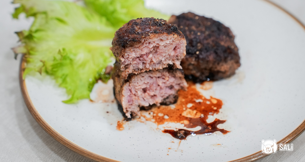 如果想讓味道更有層次,可以搭配紅酒醋醬,用紅酒、巴薩米克醋加一點糖,小火煮到稍微收稠,淋在漢堡排上超搭,切開時肉汁會慢慢滲出,口感軟嫩、很過癮,想更邪惡一點,最後再加片起司,整個直接升級