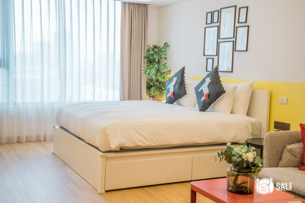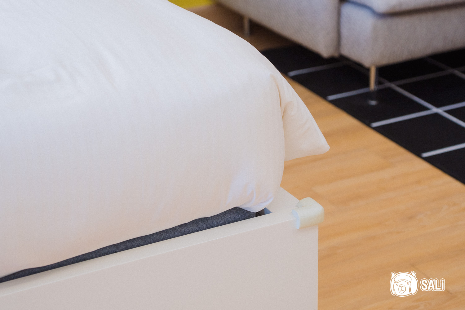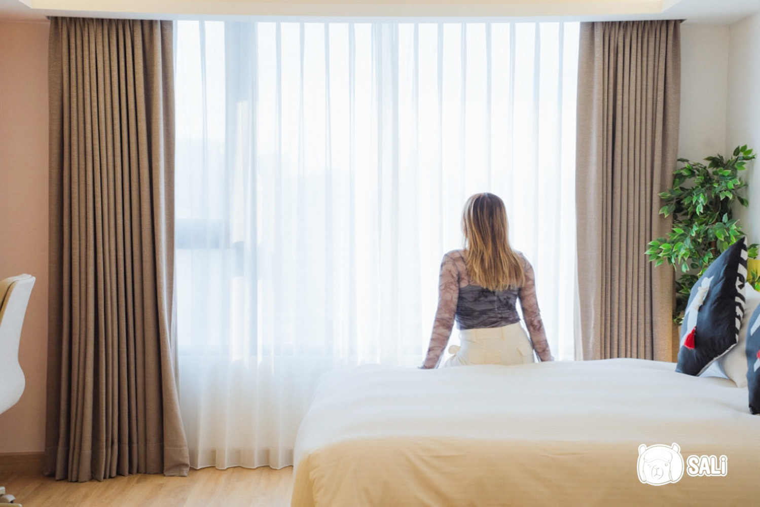房內約 12 坪,空間相當寬敞,就算攤開兩咖大行李,也還是能自在走動不擁擠,一大床尺寸為180x200cm,對兩個人來說非常舒適,床的支撐度不錯,連我這種容易認床的人,都一夜好眠沒問題,細節也顧得很周到,像是床腳還有防撞設計,小地方也感覺得出貼心