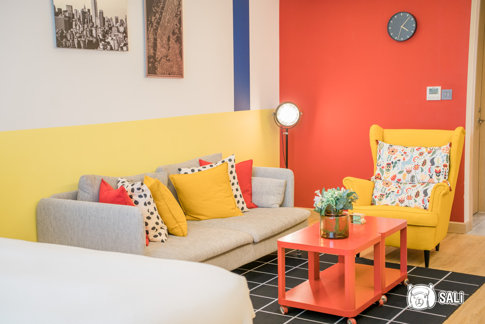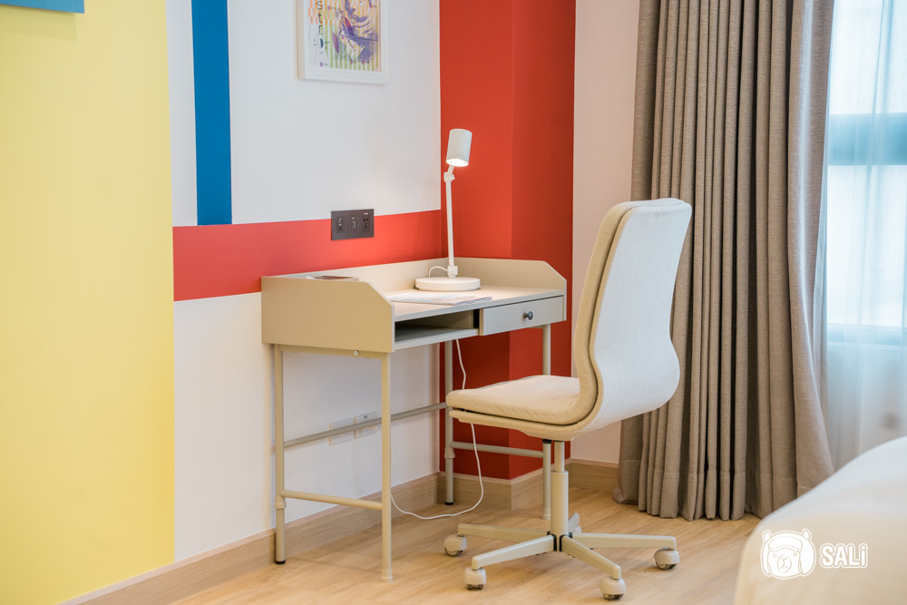 這次選擇入住 福容徠旅高雄 IKEA 主題房 北歐小屋,立刻被牆面的活潑配色吸引,以黃色、白、紅之間的跳色設計,不只點亮空間,搭配木質地板與家具,空間溫暖、活潑又不會太過張揚,整體氛圍多了幾分北歐輕快節奏