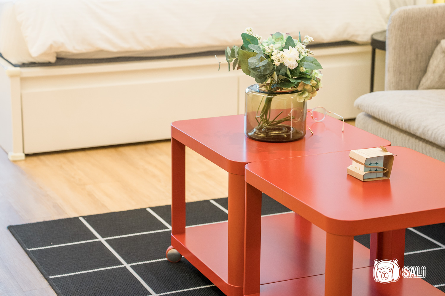 IKEA風格師親自操刀設計,從牆面色系、家具選品到小物擺飾,像是 STRANDMON 經典沙發椅(這張我超心動想購入)、簡約的木頭衣櫃、實用的工作桌、電腦椅、全身鏡,抱枕都挑得恰到好處,色彩活潑卻不雜亂,真的像住進了IKEA 型錄裡