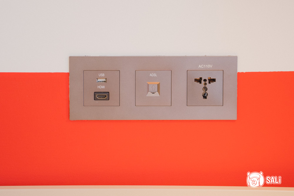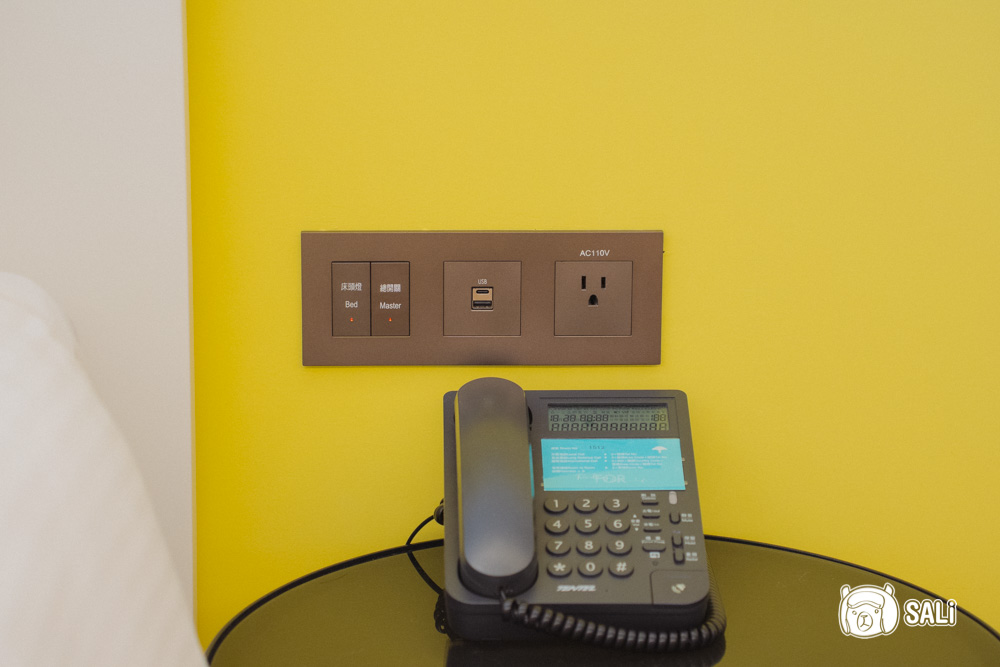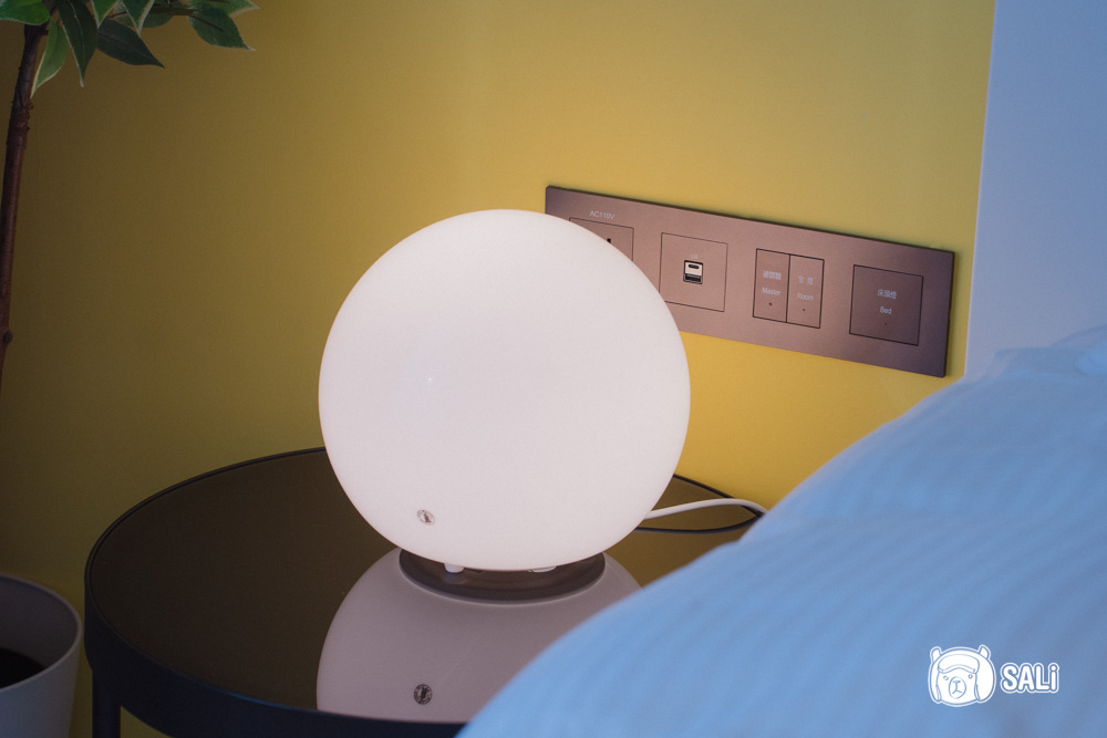 房內的開關設計得很方便,都集中在床的兩側,開關燈不用下床就能搞定。插座和充電孔也很齊全,手機、相機、行動電源一起充都沒問題,還有一盞柔和小夜燈,晚上起身不怕摸黑撞腳
