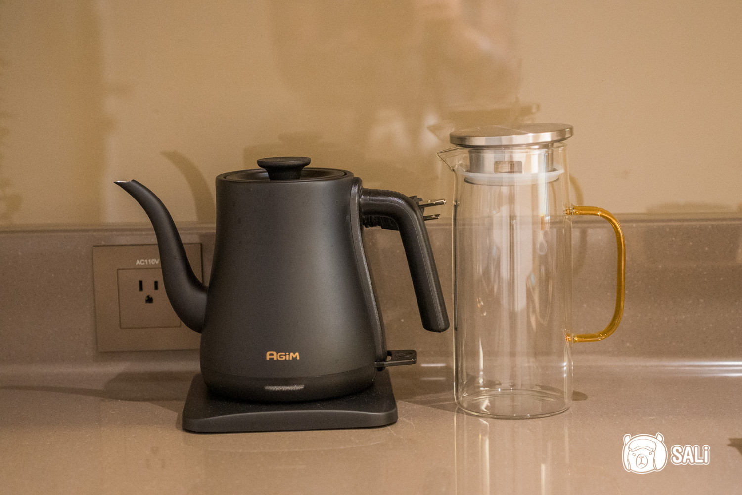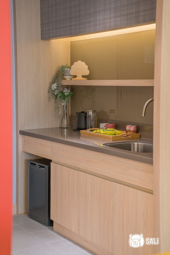 一進房,左側是簡約實用的茶水區和冰箱,小巧吧台上放著快煮壺與冷水瓶,福容徠旅高雄店響應環保政策,房內不提供瓶裝水,而是準備可重複使用的水壺,旅客可自行到走廊的飲水機裝水,旅行之餘也能為地球盡一份心力。