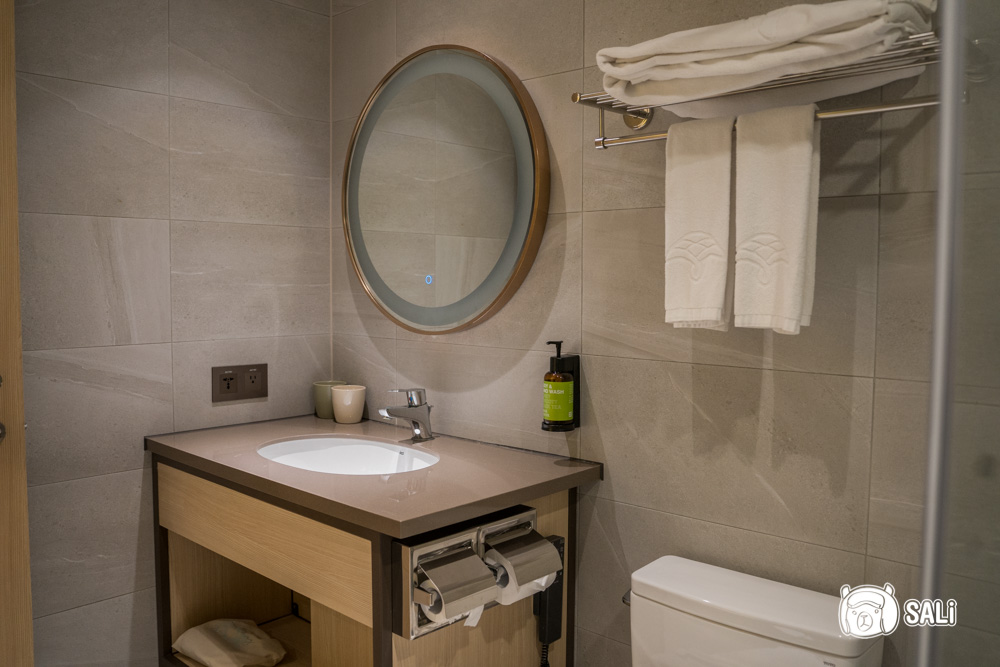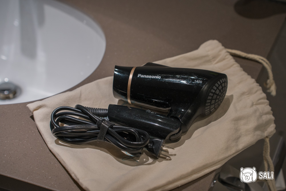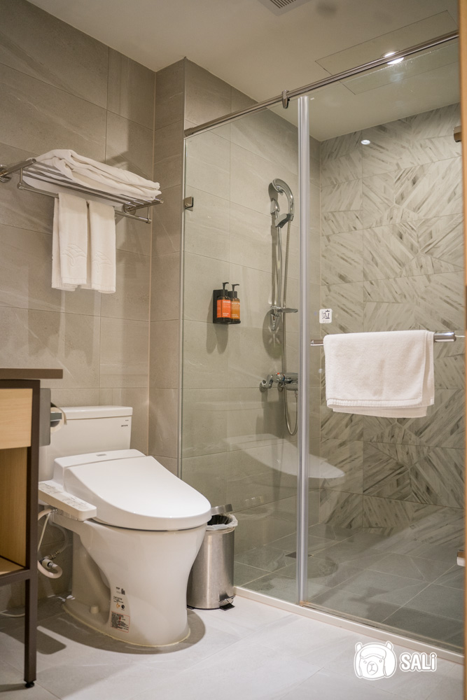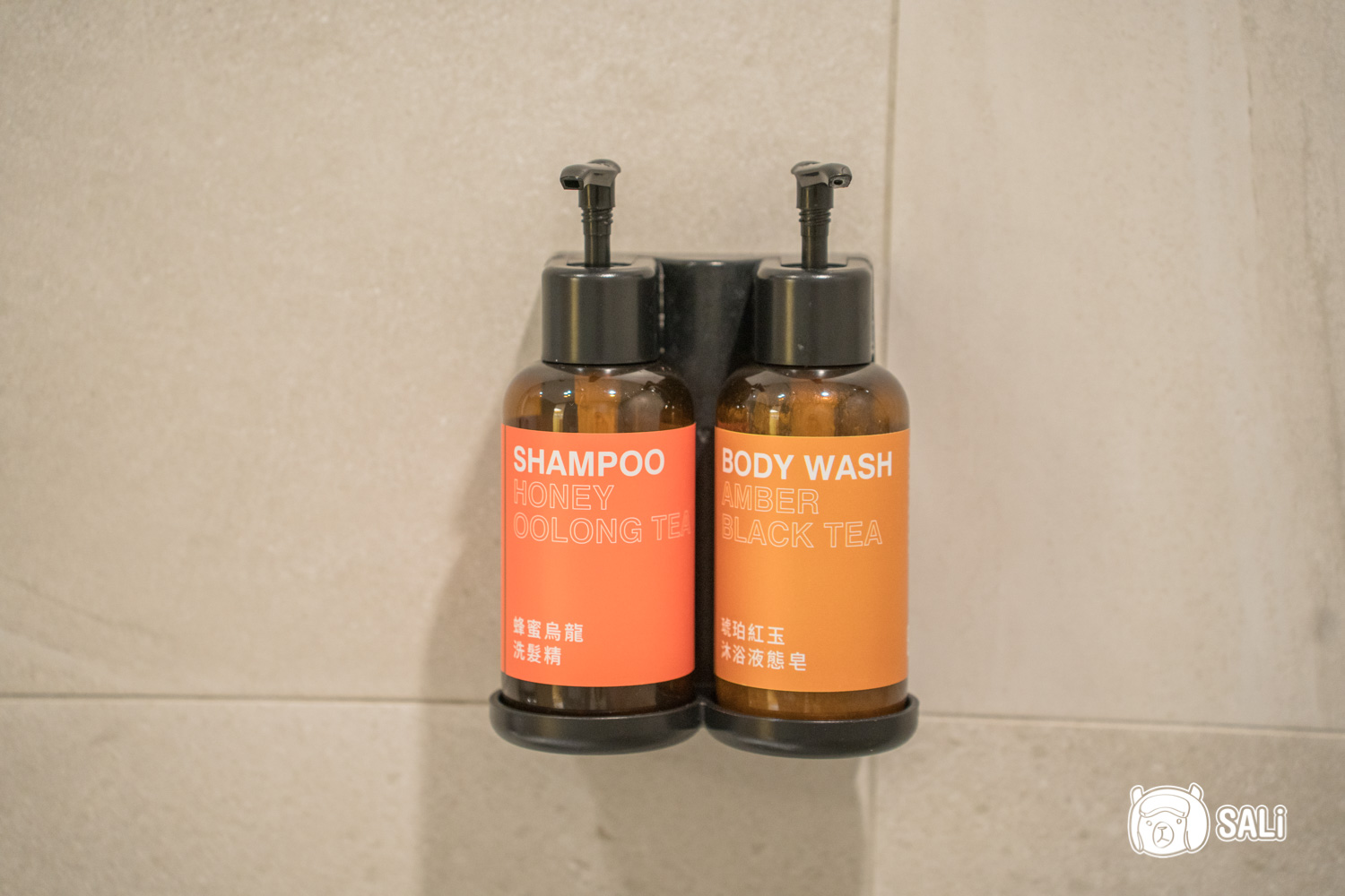 洗沐用品選用的是「一日茶道」系列,洗髮精、沐浴乳、洗手乳,都帶有淡淡茶香,洗起來舒服,有種被茶香輕輕包圍的療癒感,還有免治馬桶和吹風機,簡單實用