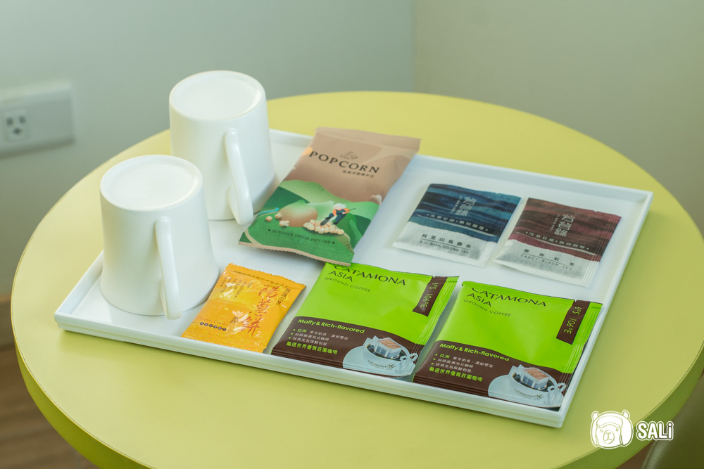 房內也貼心準備茶包、咖啡,還有零嘴及在地名產,洋蔥餅這種地方限定的小驚喜,感受到選物的用心