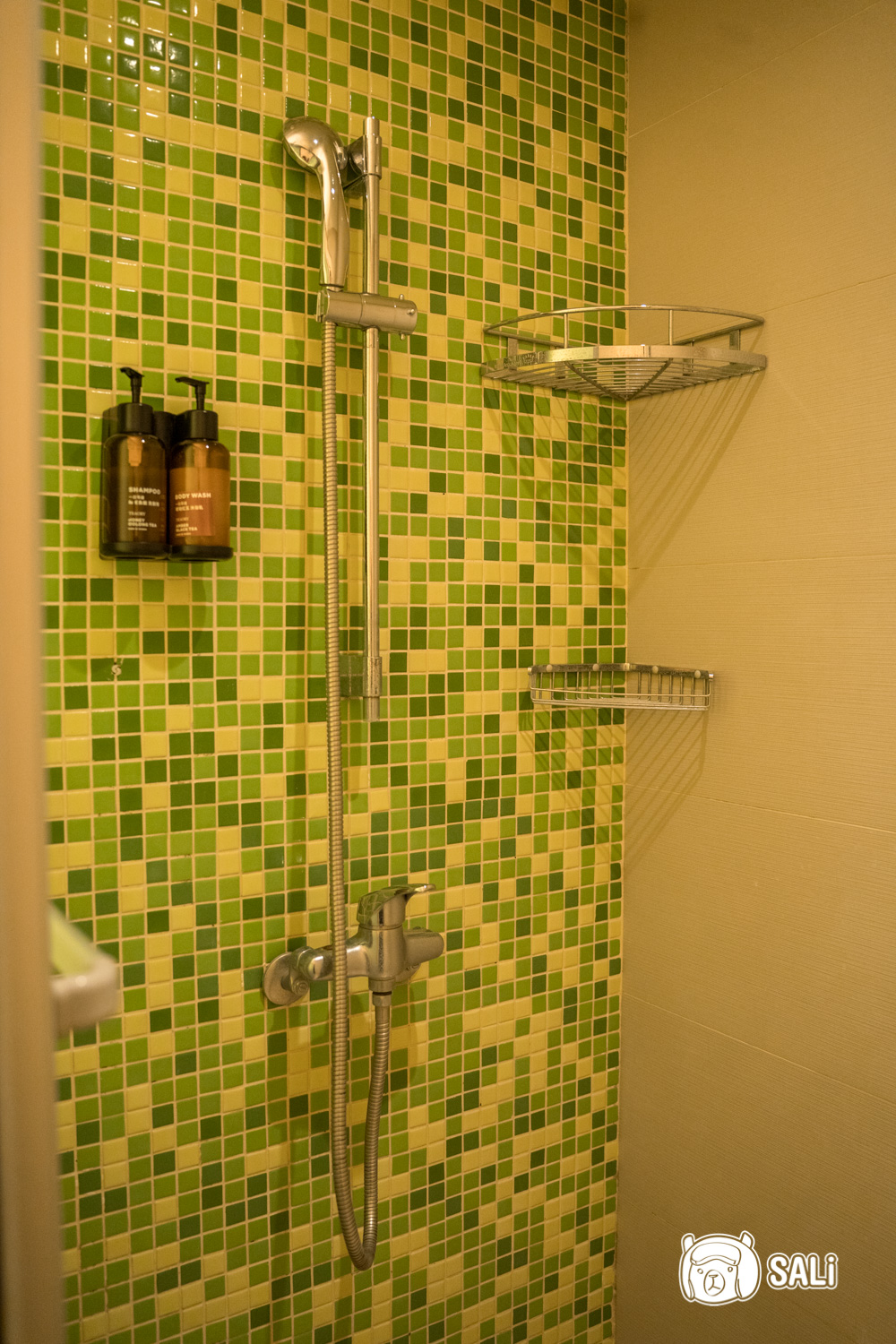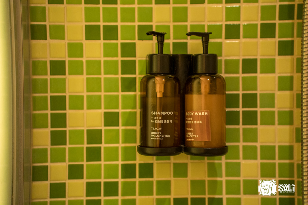 衛浴是乾濕分離的設計,最喜歡他們選用的沐浴備品,來自台灣保養品牌「一日茶道」,徠旅系列全館都用這組,蜂蜜烏龍洗髮精和琥珀紅玉沐浴乳都有淡雅茶香,溫和又療癒,洗完像整個人被茶香輕輕包住,身心格外放鬆沈靜