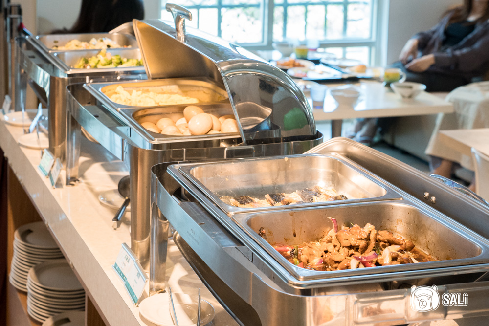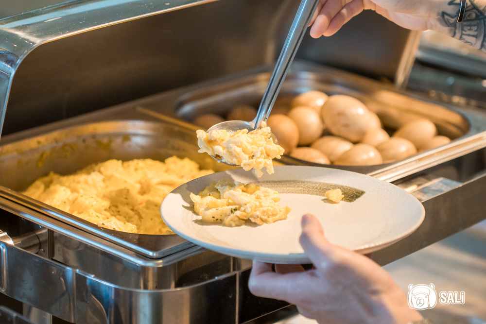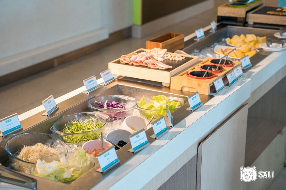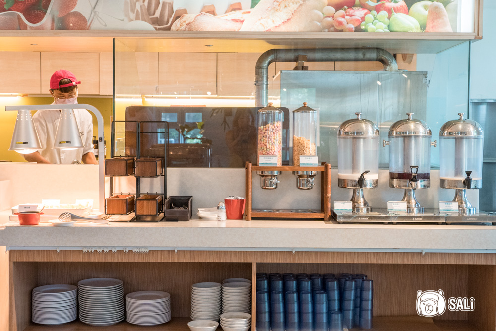 早餐供應在早上 7:00 到 10:00,採自助式,上次在高雄店吃過一次早餐後,就對福容徠旅的餐點印象很不賴,雖然不是那種菜色爆炸多的 buffet,但熱菜、青菜、白粥、沙拉、麵包和起司等都有,飲品有咖啡、無糖豆漿、牛奶、蔓越莓汁,選擇也很足夠。