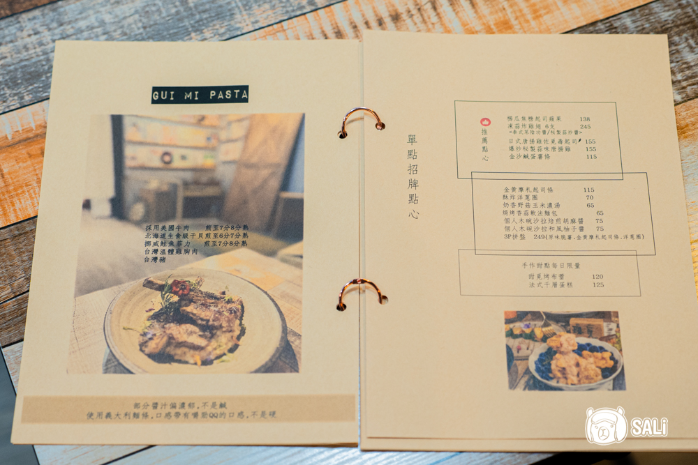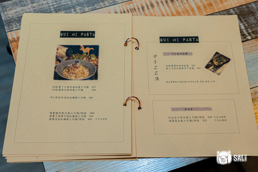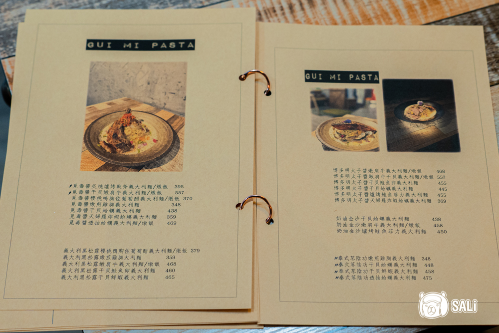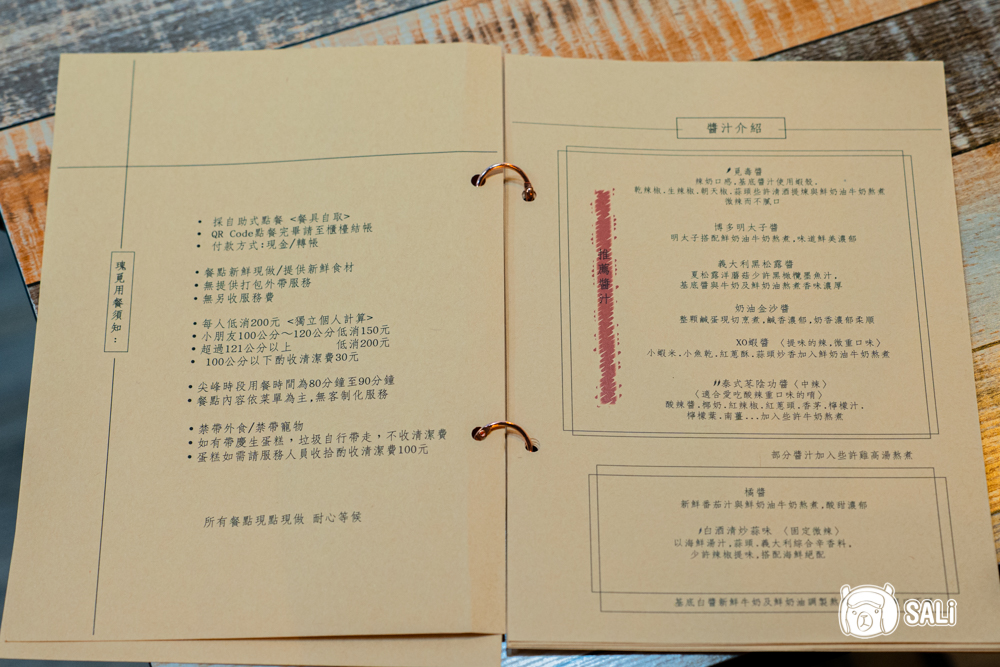 瑰覓 GuiMi 的餐點選擇不少,主打手工熬煮醬汁,從肉品、醬料全都自己做,不用半成品或料理包。醬汁以白醬為基底,延伸出九種不同風味,另有白酒蒜香清炒可選。每種醬料在菜單上都有介紹,點餐時能快速找到自己喜歡的味道,主餐皆附一杯覓紅茶,更換其他飲品可折 30 元。也能升級套餐