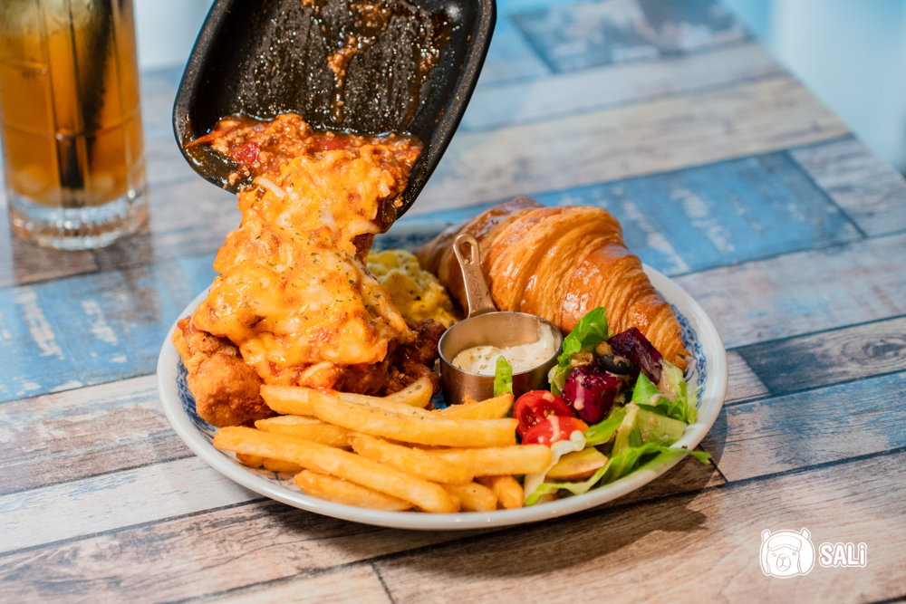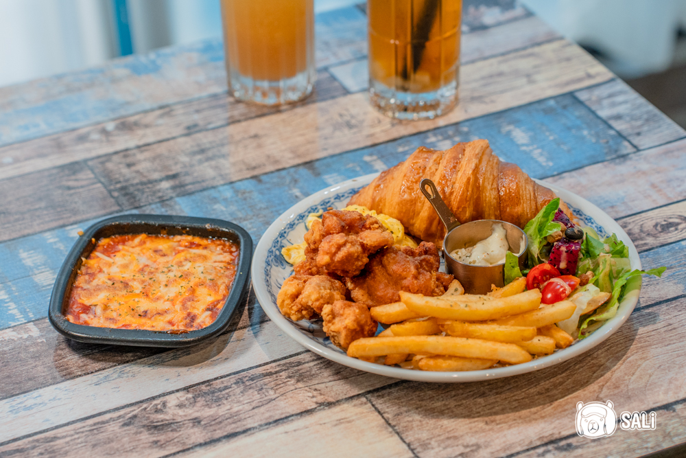這道直接封它瑰覓最療癒的鹹香組合,上桌那刻,波隆那肉醬與乳酪絲一起融化成起司瀑布,緩緩淋在金黃唐揚雞上,香氣瞬間炸開,旁邊的焦糖可頌外酥內Q、熱熱吃最剛好,搭配水果沙拉、嫩蛋與脆薯,一盤裡鹹甜交錯、層次滿滿,塔塔醬可以拿來沾唐揚雞或薯條,酸香解膩,從第一口到最後一口都很滿足
