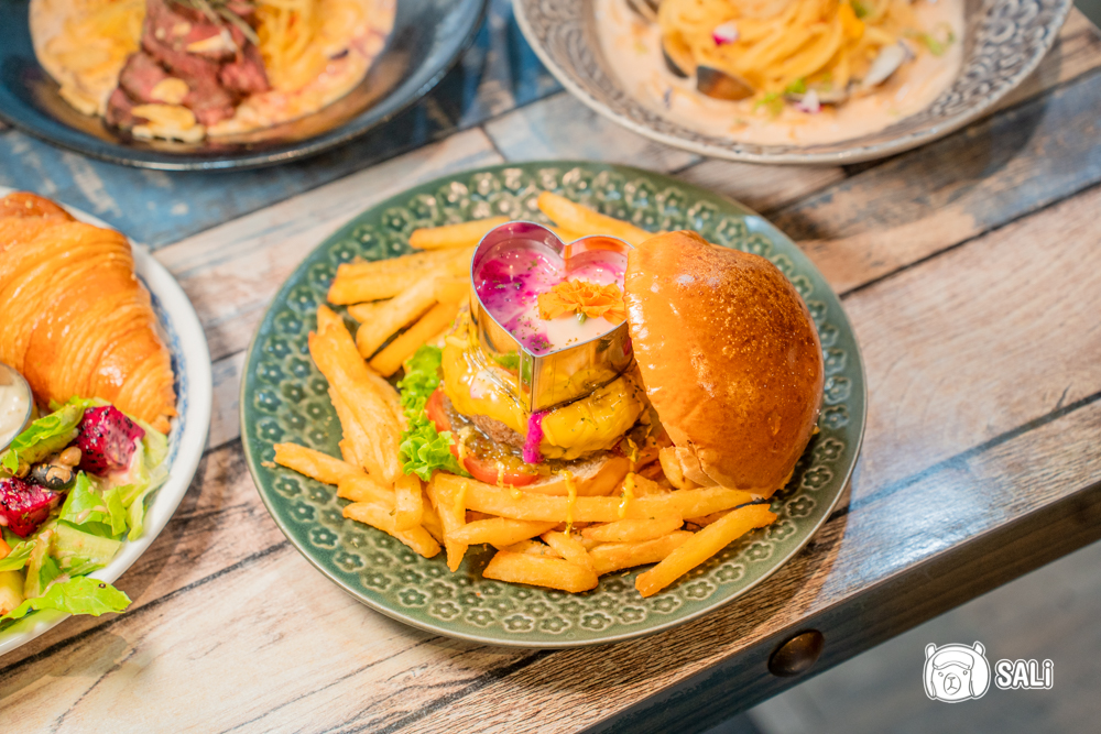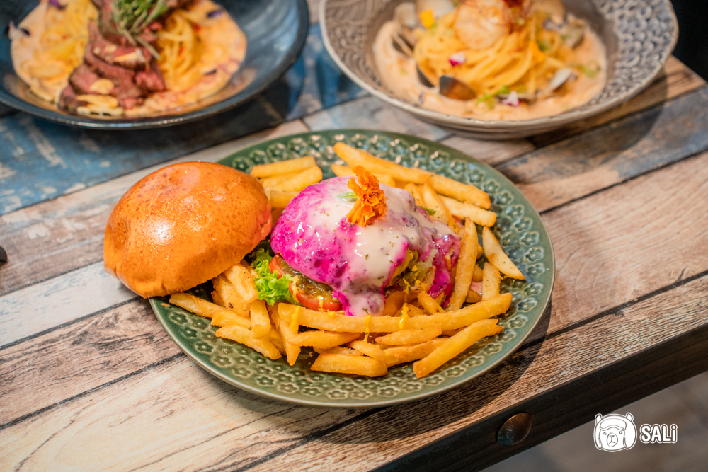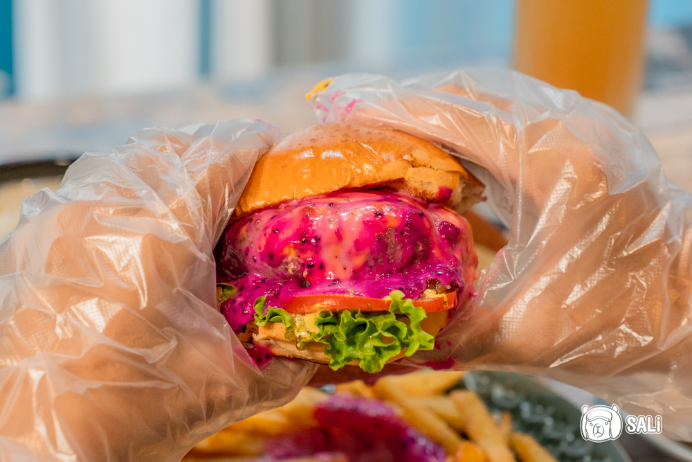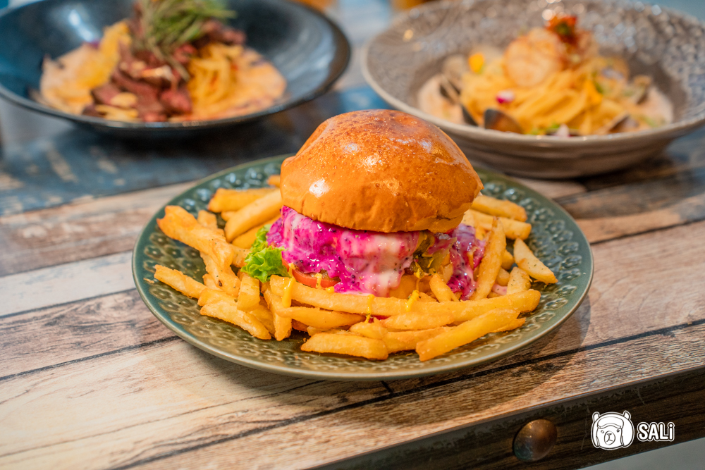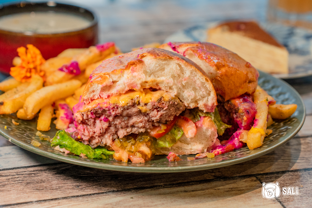 柔軟的布里歐麵包夾著厚實 7 盎司手打牛排,一口咬下爆汁香醇,交織手工荷蘭醬、甜碎瓜與生菜番茄,鹹香中帶著淡淡果香,整體口感層次豐富、輕盈飽足,這款浮誇系漢堡不只好拍,連風味都讓人一吃就愛上