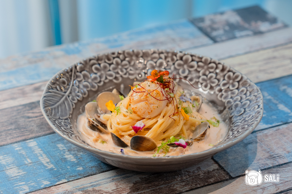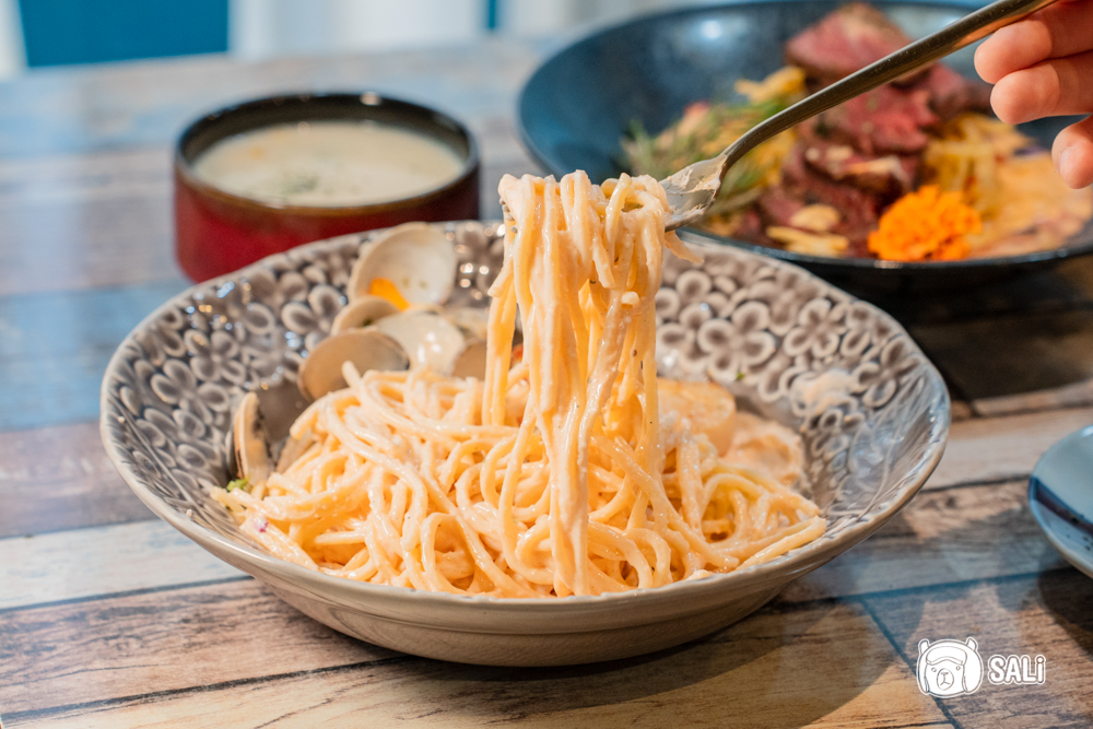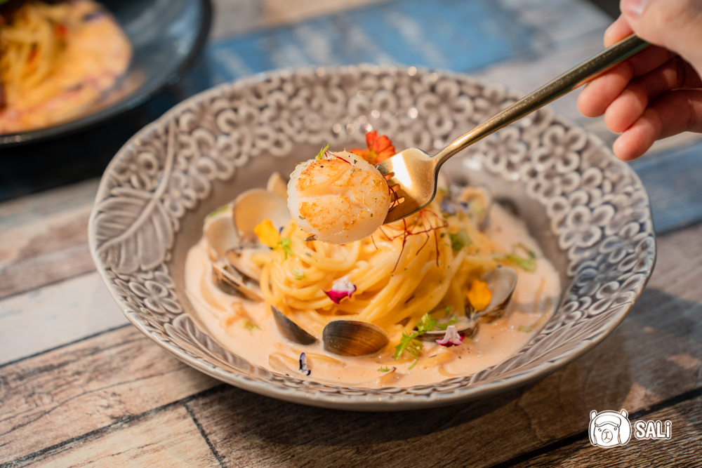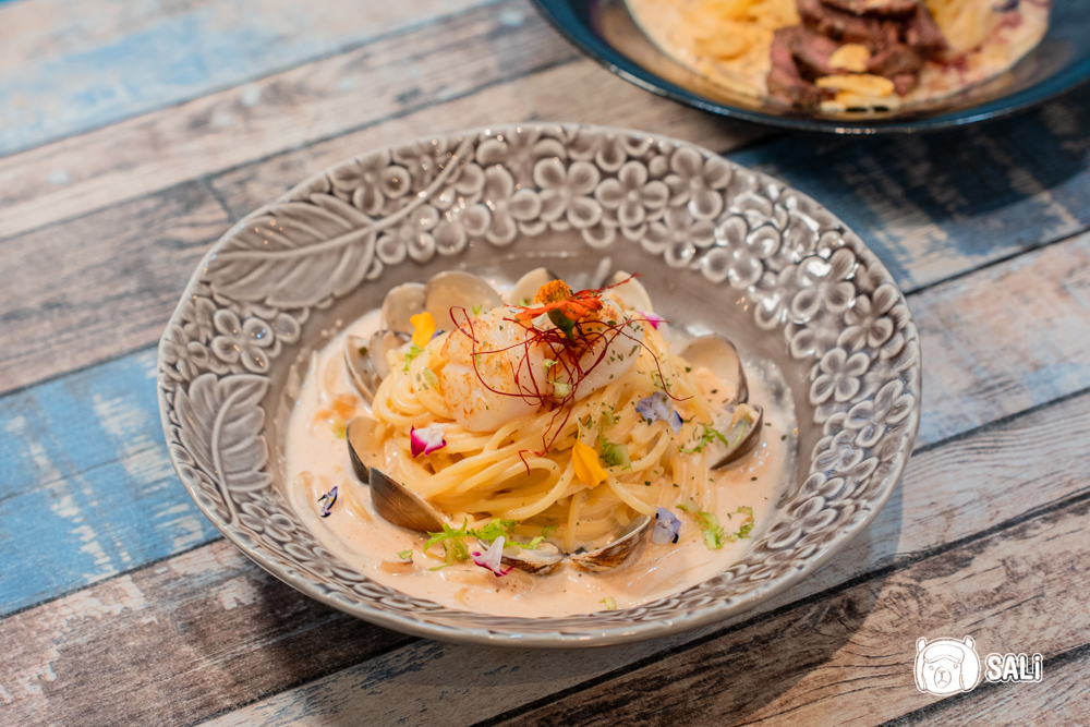 濃厚奶香中帶著明太子的微辣鹹香,醬汁滑順地緊包著麵條,濃郁卻不厚重,干貝煎得恰到好處,外層微焦、裡頭柔嫩,咬下去滿是自然的海味鮮甜,麵條彈牙、收汁剛好,明太子與奶香交織出柔和層次,整體順口不膩、風味乾淨。份量剛好又讓人滿足,是那種會默默舔乾盤的好吃程度