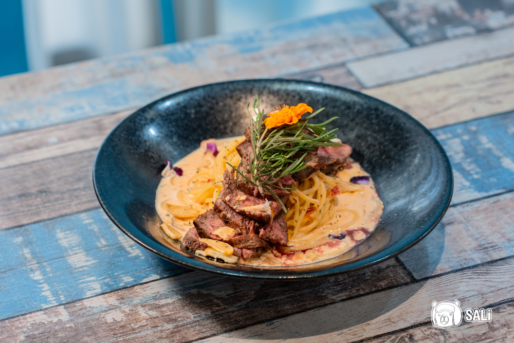 來瑰覓一定要試試他們的特製覓毒醬。以白醬為底,加入蝦殼、蒜頭和三種辣椒翻炒提香,辣得溫柔又過癮,香氣一上桌就先偷跑出來。那種微辣帶海味的層次感,讓人一口接一口完全停不下來。搭上整條嫩肩牛橫跨盤面,煎到外層微焦、裡頭粉嫩多汁,肉量給得大方,吃起來像排餐一樣滿足。麵條Q彈吸汁,每一口都沾滿醬香與牛肉油脂的香氣,濃厚卻不膩,整體平衡得恰到好處