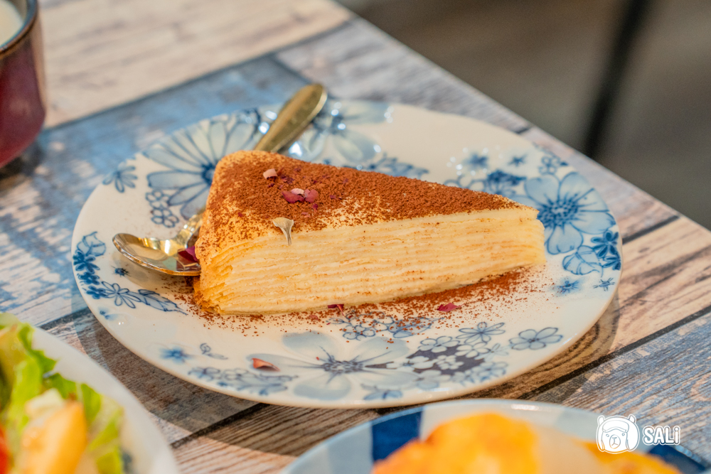每天都是自家手工製作,數量不多,想吃真的要趁早。蛋皮層層薄嫩、口感柔滑,夾著輕盈鮮奶油,甜度剛好不膩。上層灑上可可粉,微苦香氣讓整體更有層次。整體風味乾淨又細膩,一口下去是溫柔又單純的甜。加購價還不到百元,佛心又好吃