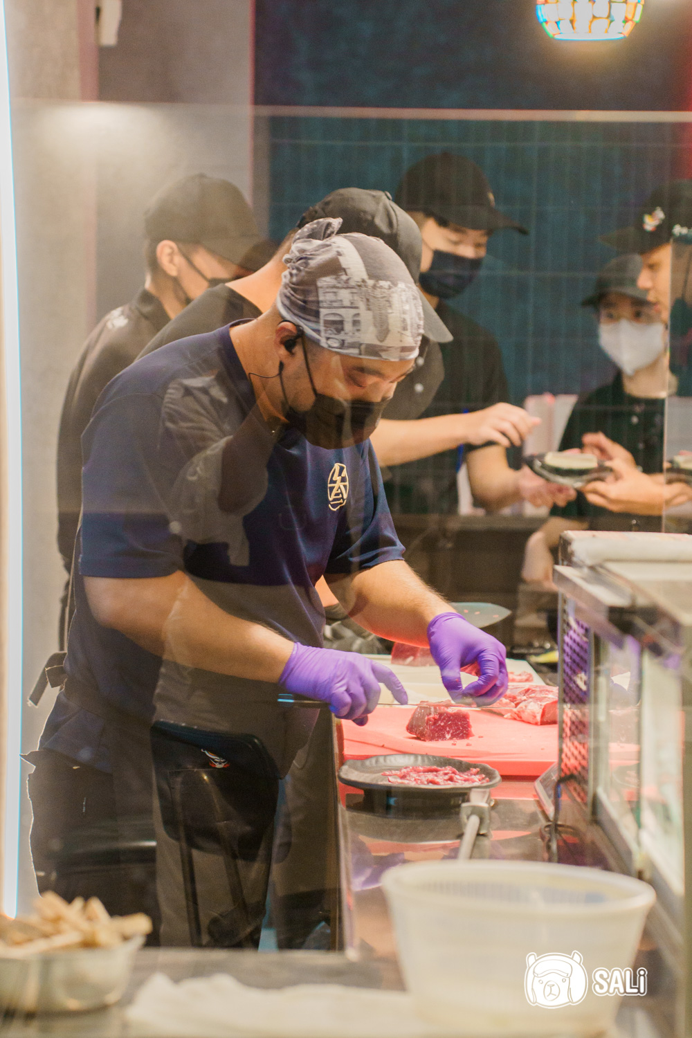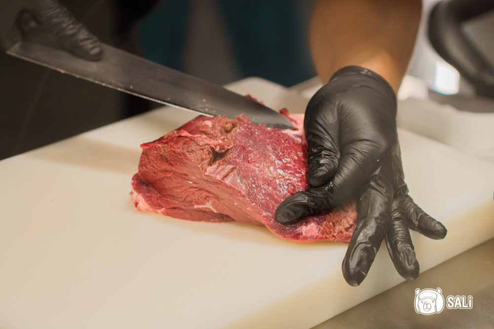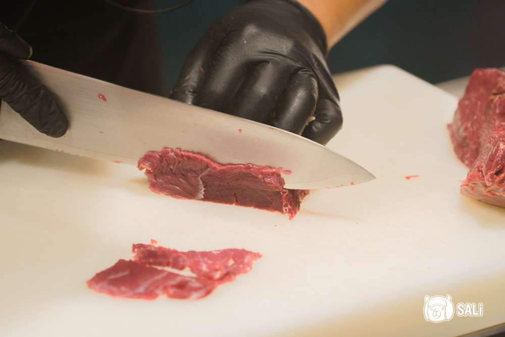 分切時店員會先細修筋膜,再片成適合入口厚度,料理區台面保持得非常整潔,看著牛肉從原塊處理到上桌,那種安心感與美味,感受也吃得到