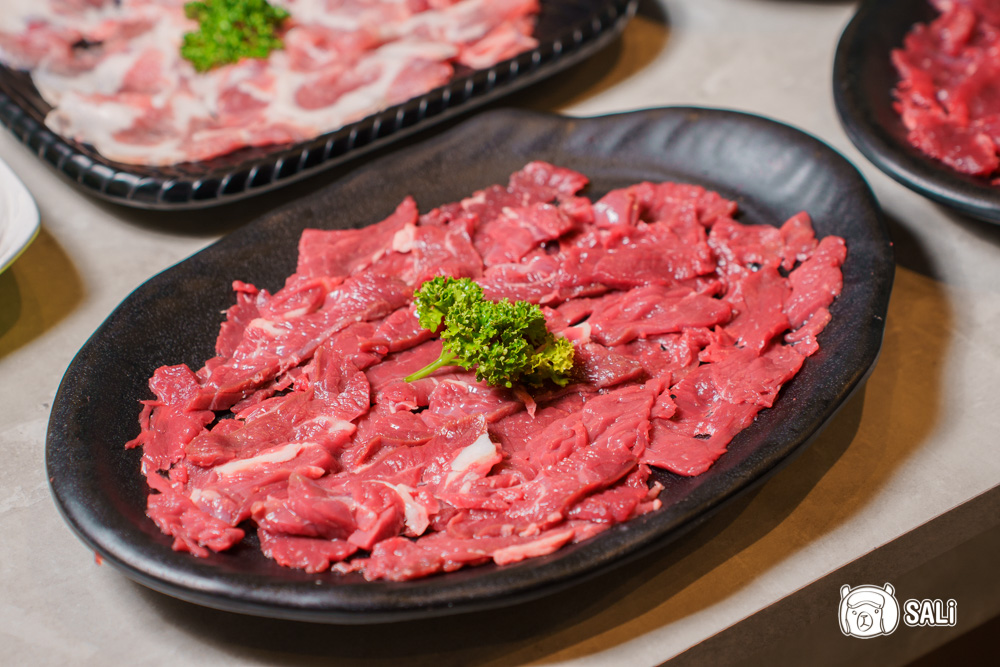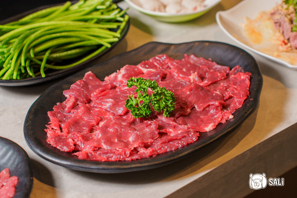 現宰直送、沒有經過冷凍處理的溫體牛,完整保留牛肉最純粹的甜味和柔嫩質地,頂級牛肉片油花分布均勻、肉色鮮亮,透著自然光澤,片成剛剛好的厚度,光看就讓人食指大動
