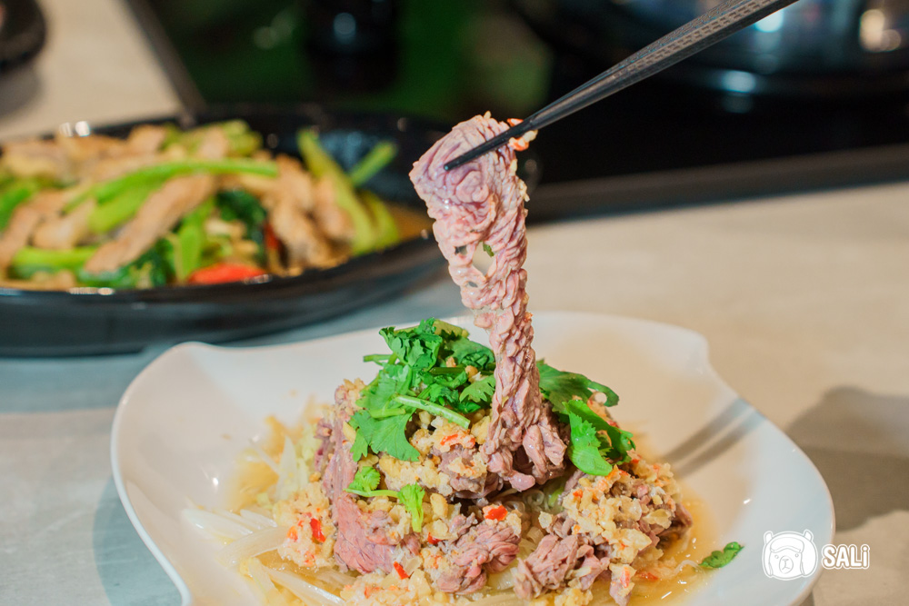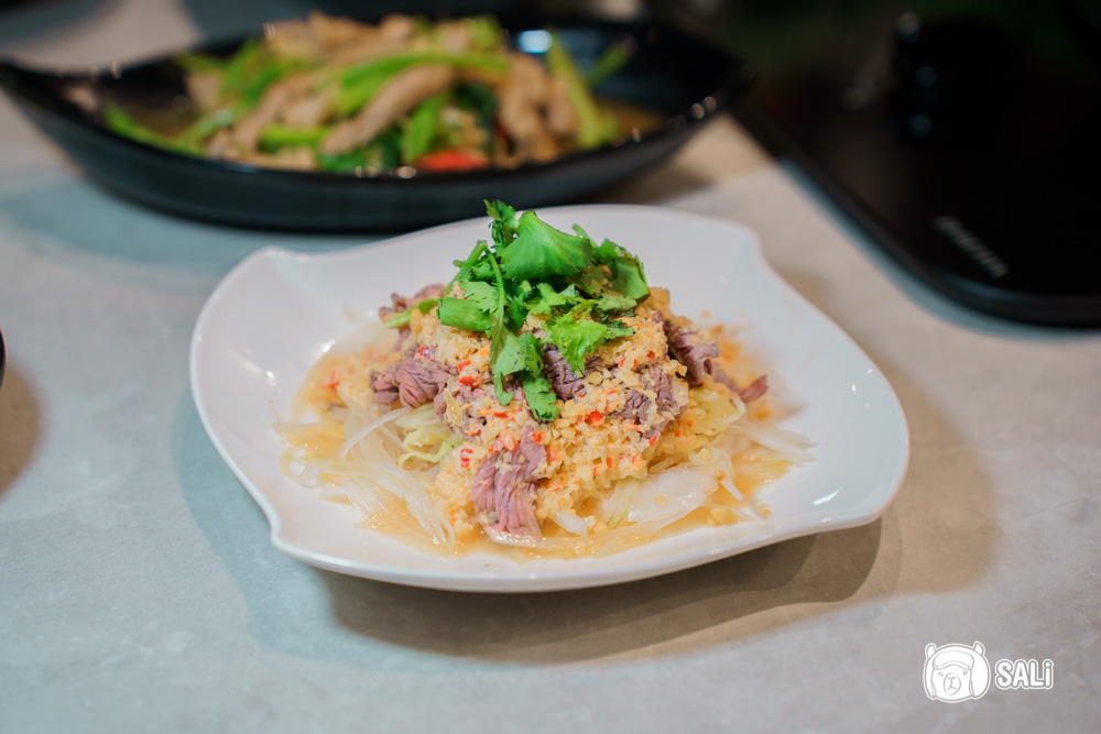 用新鮮溫體牛稍微川燙,拌入泰式醬汁,酸、辣、甜、鹹交織,味道層次豐富,牛肉帶著微微嚼勁,還吃得到肉的鮮甜,搭配洋蔥和香菜一起入口,清爽又開胃,完全是重口味派的夏日救星
