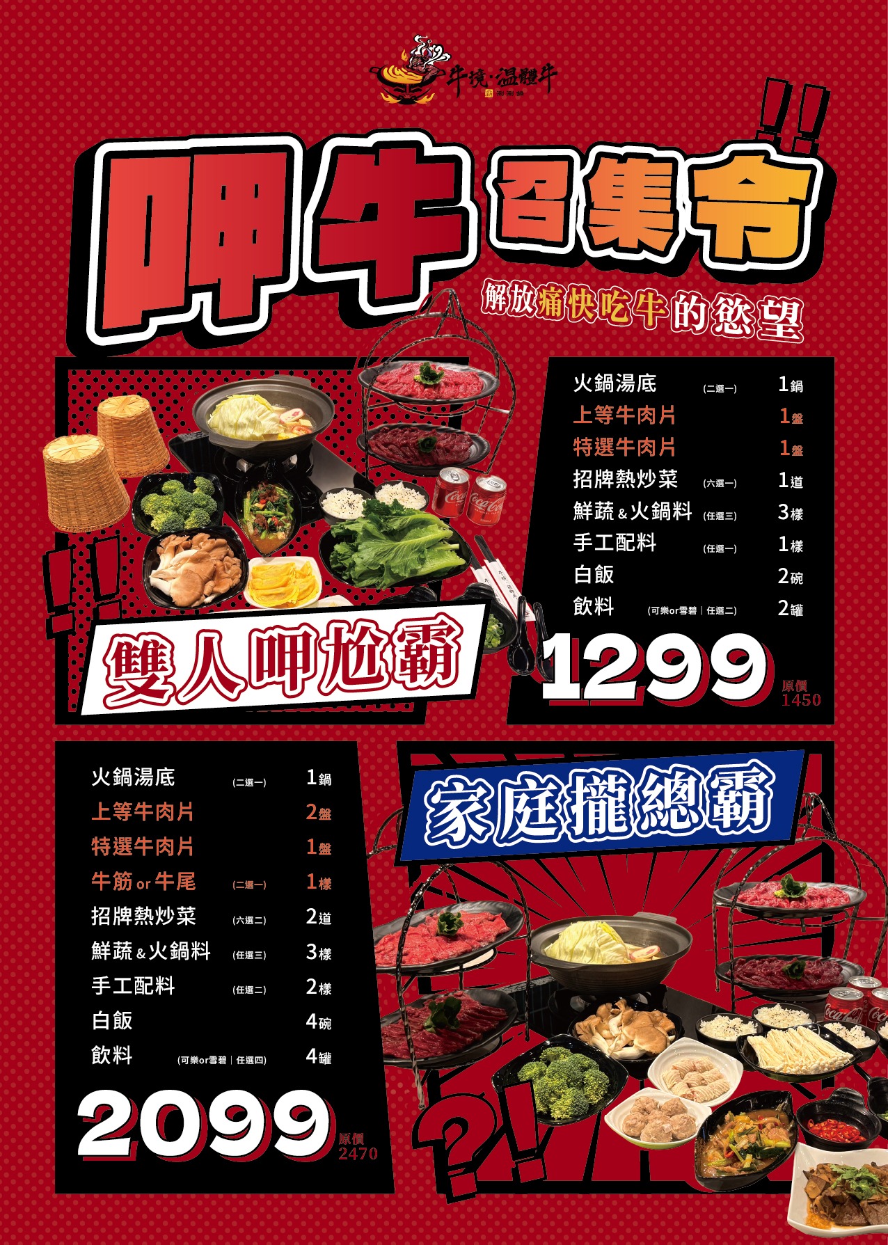 含火鍋湯底(2 選 1)、上等牛肉片 *1 盤、特選牛肉片 *1 盤、招牌熱炒(6選 1 道)、鮮蔬&火鍋料任選 3 樣、手工配料 1 樣、白飯 *2 碗、飲料 *2 罐,火鍋+熱炒一次滿足