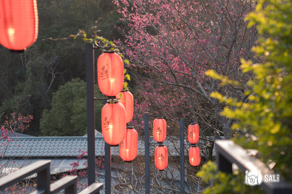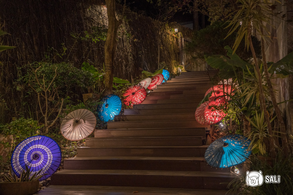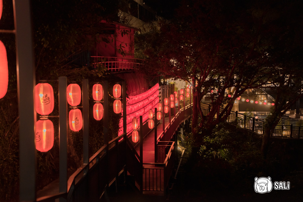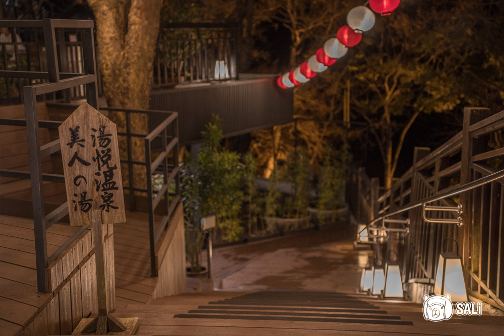 從二、三館搭電動車抵達本館後,會先經過一段紙傘步道,白天看起來溫柔寧靜,晚上燈一亮,搭配一路延伸的紅燈籠,及整面燈籠牆,就像是漫步在日本某個溫泉小鎮,這裡是湯悅溫泉會館最熱門的拍照點,如果你愛拍照,入夜真的要出來晃晃,白天夜晚各有風景,邊走邊拍怎樣都好看