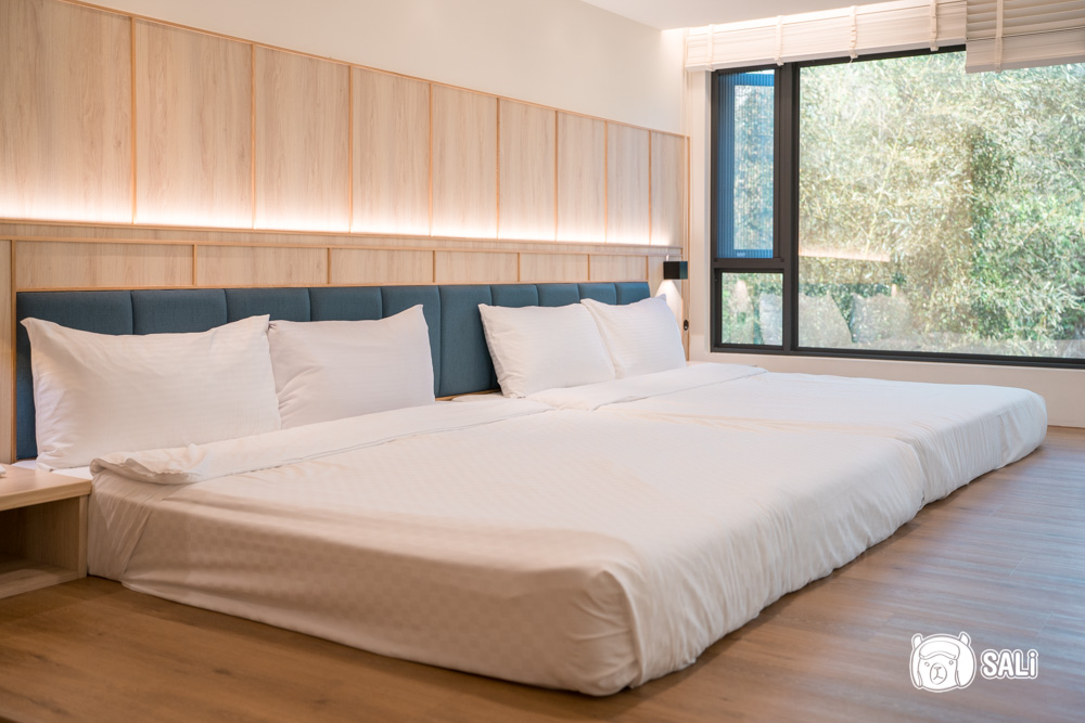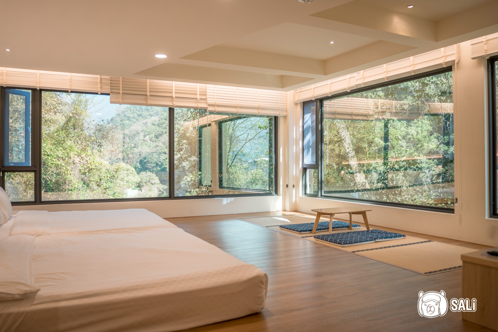 這次入住湯悅溫泉會館的 禪悅和/洋式套房,也是館內坪數最大的房型,270度的大片落地窗把整片山景框進來,簡約的木質風格,色調溫柔,賴在房內也值得