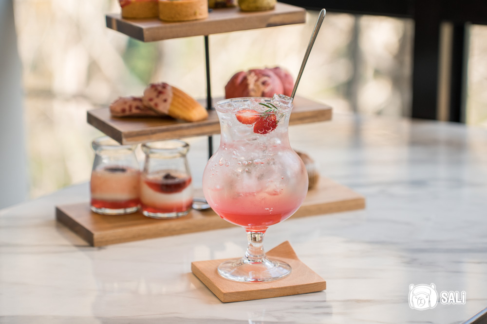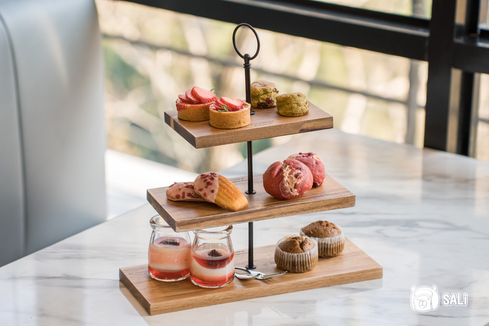 這次我們選擇一泊三食的專案,包含雙人份下午茶,晚餐和早餐都在館內餐廳用餐,剛好遇上草莓季,三層英式下午砸,從甜點到飲品都被草莓佔據了版面,有草莓塔、草莓瑪德蓮、草莓乳酪麵包、草莓奶凍,每樣都可愛得不行,還搭配草莓氣泡飲和草莓拿鐵,酸甜討喜、顏值也高