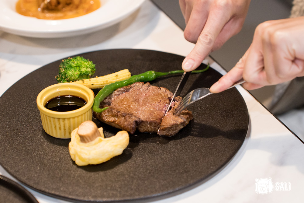 主廚套餐主餐為牛排,五分熟度剛好、口感軟嫩,前菜的米糕上還放了炸芋頭絲,香香脆脆,還有沙拉和湯品,小菜,最後還有手作點心收尾,整套風味有一定水準,吃得相當飽足