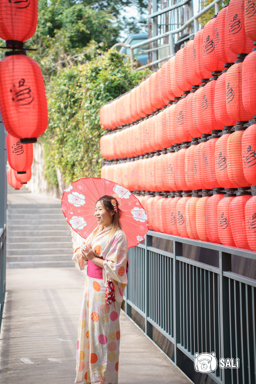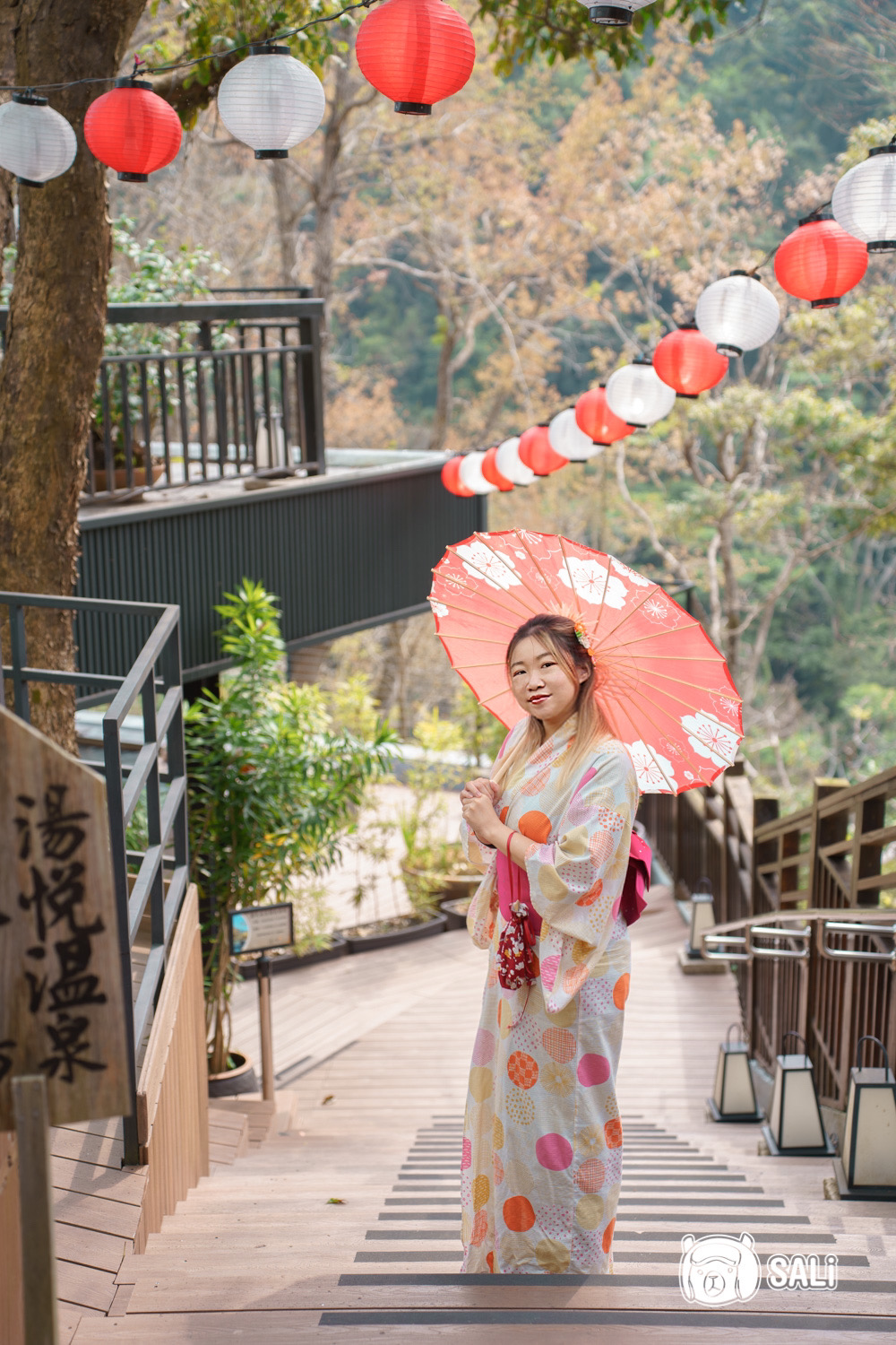 浴衣款式很多,穿上後從頭到腳都幫你搭配好,換好裝我們就直奔紙傘步道跟紅燈籠牆拍照,整體氛圍真的超日,怎拍都好看