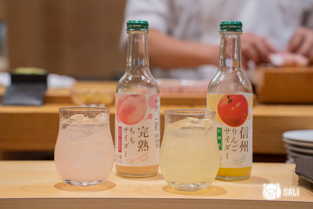 享受無菜單日料之時,喜歡小酌的朋友很適合來點清酒搭配,現場也有提供無酒精飲品,當天選擇日本汽水 水蜜桃與蘋果兩款,氣泡細緻清爽甜度不高,搭配料理剛好解膩