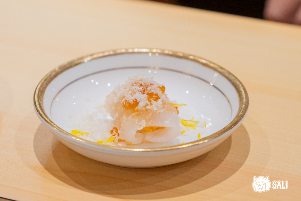 澎湖軟絲切工相當細緻,口感柔軟中帶彈性,入口是乾淨俐落的海味;搭配溫潤濃郁的海膽醬、鮭魚卵帶出的鹹鮮亮點,以及夏威夷果碎微脆與淡淡奶香,整體層次協調、風味不搶戲,比例拿捏得很到位