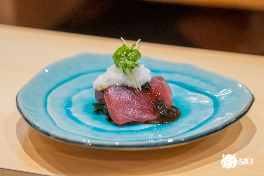 選用日本長崎黑鮪魚背部肉,屬於油脂較少的部位,肉色鮮紅、口感偏緊實;搭配自製海苔醬的鹹香與山藥泥的滑順質地,入口風味柔和、尾韻舒服