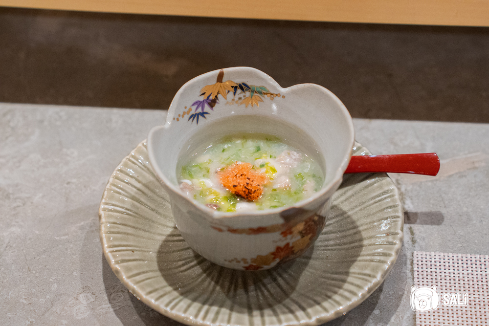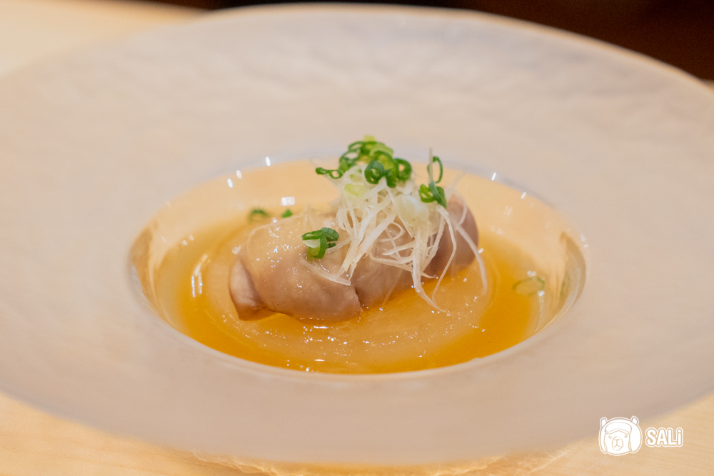 鮭魚白子口感細嫩滑順,有點像豆腐般柔軟,入口後帶出溫和的海味層次,搭配以貝柱熬煮的清湯,風味乾淨有旨味,日本蘿蔔燉煮後帶微甜口感,整體輕柔又有深度的風味