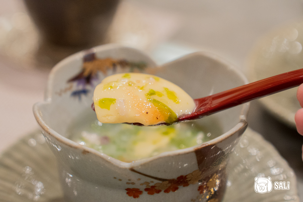 這道以軟絲為主角的海鮮茶碗蒸,蒸蛋口感細緻滑順,上層以翠綠海草與炙燒明太子點綴,溫潤又帶海味氣息,明太子的鹹香讓湯底鮮度更明顯,裡頭的軟絲切成小塊,吃起來柔軟中帶彈性