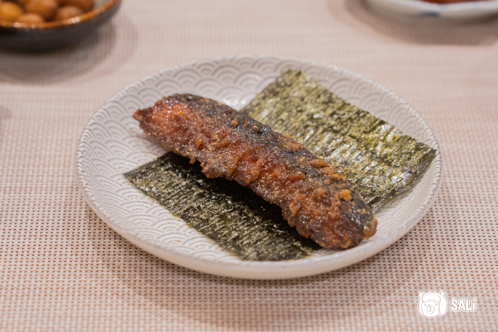 鰻魚以天婦羅方式酥炸,外層薄脆乾爽不含油膩感,出鍋後刷上鹹甜醬汁,再撒上一點山椒粉,香氣層更提升,包上海苔一起入口,多份海味與脆口對比,裡面魚肉依然柔軟帶彈性,咬起來外脆內嫩,味道濃郁又很涮嘴