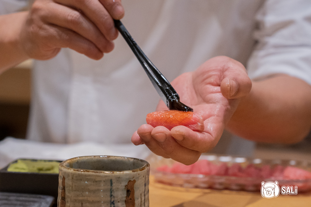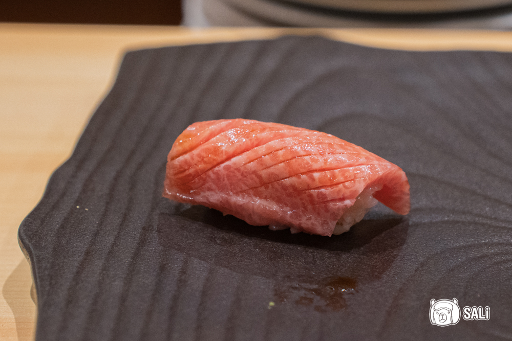 黑鮪魚大腹的淡粉色油花紋理真的很美,口感柔軟細膩,油脂在嘴裡慢慢化開,自然甜感與海味縈繞嘴中,不用刻意咀嚼就能感受到滑順與飽滿,完全是一口就會被收買的幸福