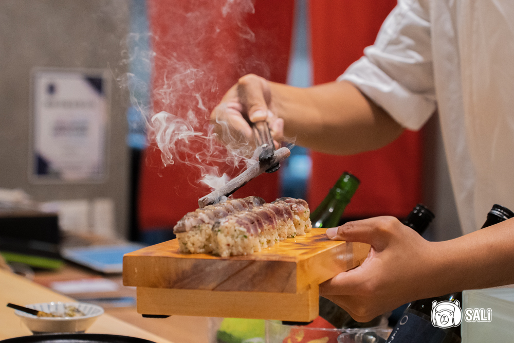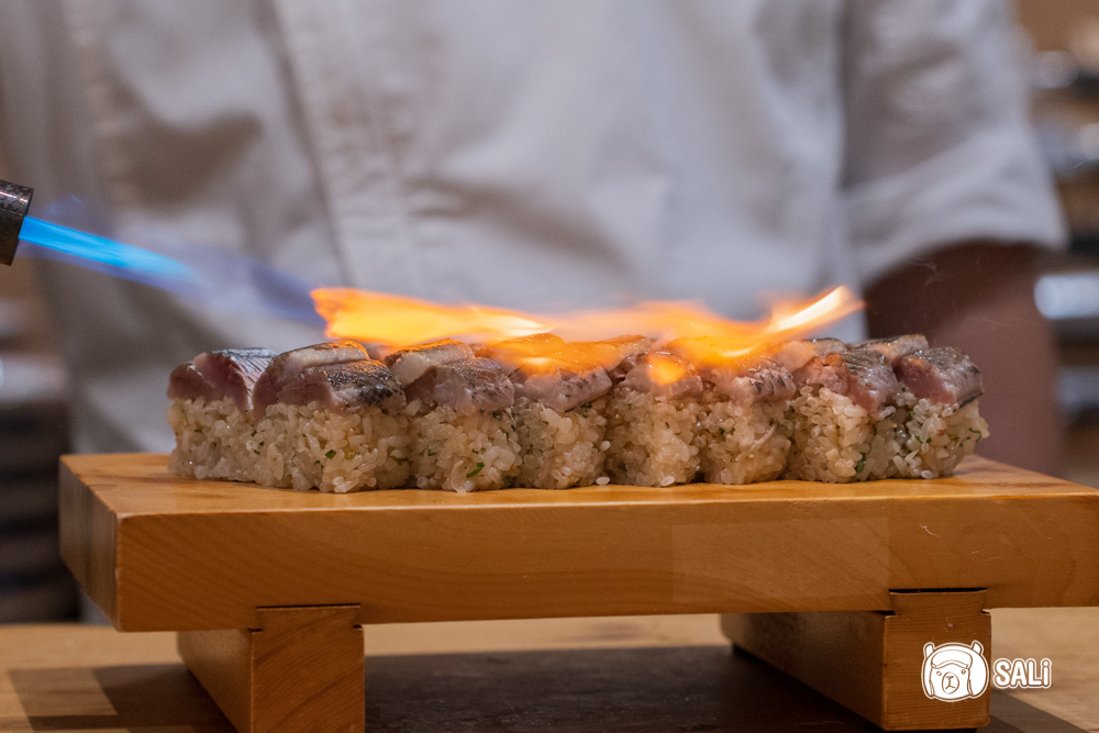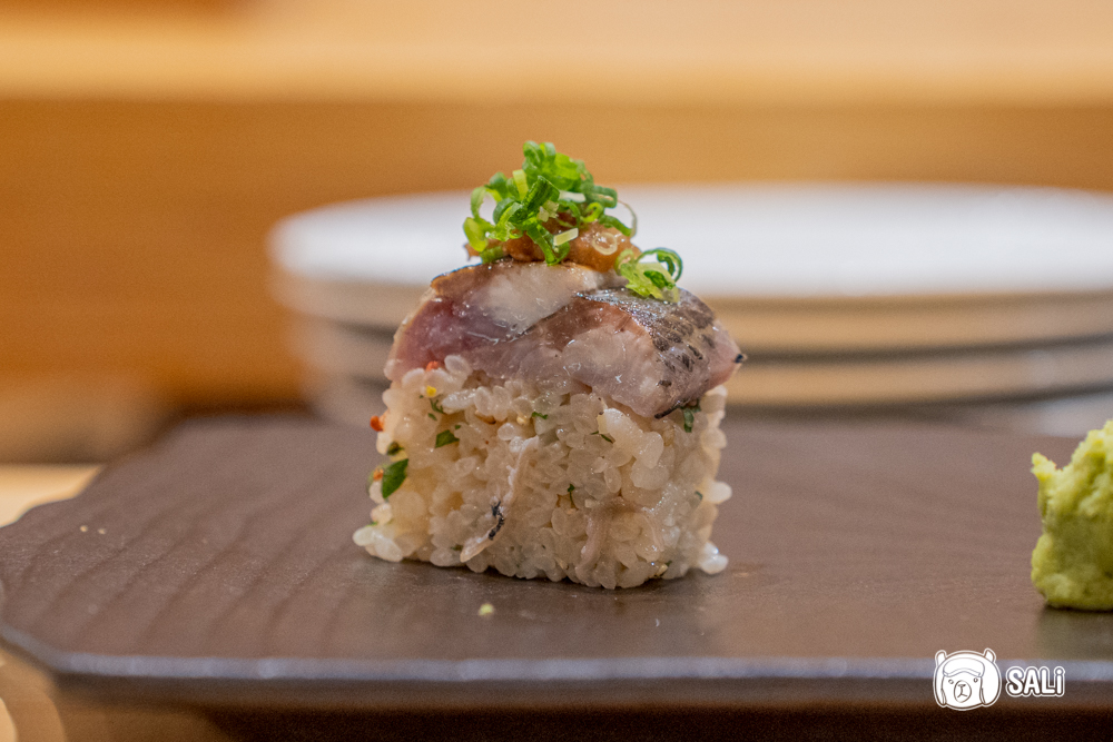 將醋飯與秋刀魚壓實成棒狀,口感更緊緻,風味因此集中。秋刀魚先經過炙烤,再以備長炭燒出微焦香氣與淡淡炭燒風味,油脂被喚醒後味道更顯圓潤,搭配梅子肉的酸甜與萬能蔥的清香,整體清爽又平衡
