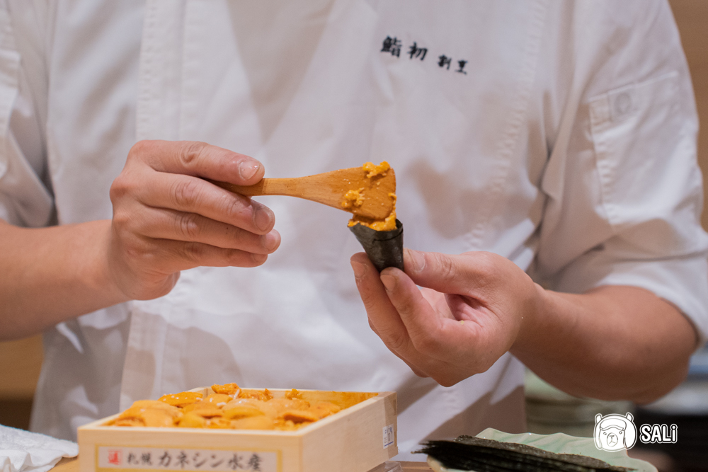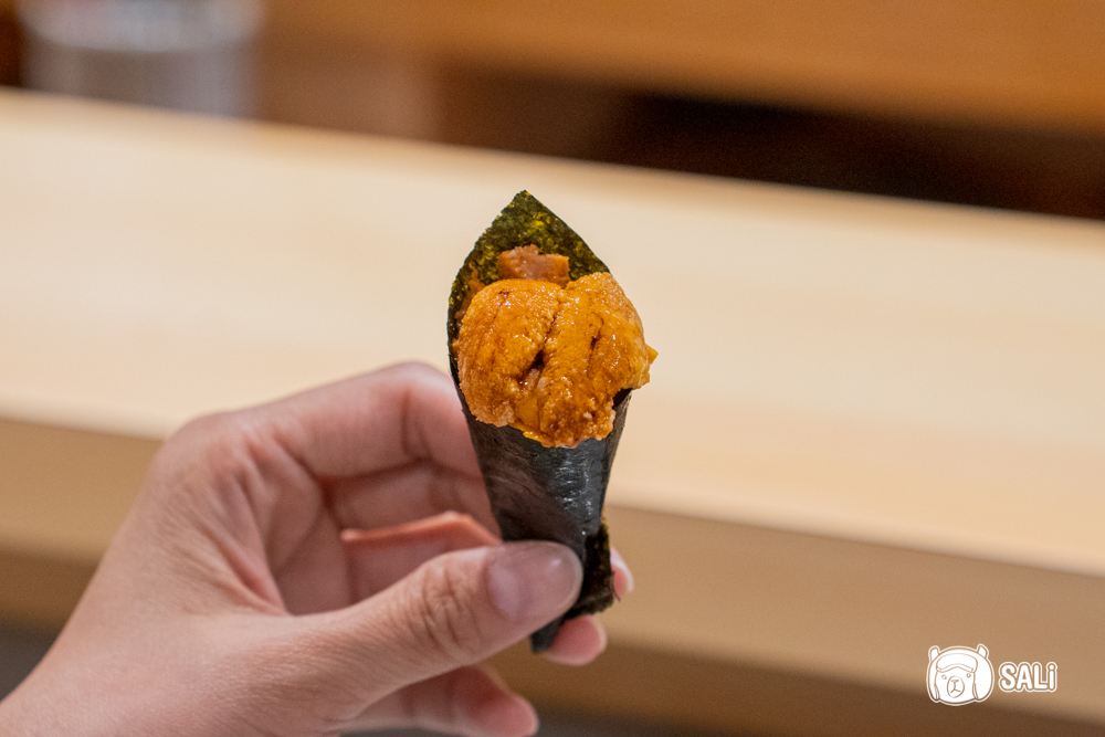 嚴選北海道札幌的馬糞海膽,製作成迷你海膽甜筒,視覺上就先讓人眼睛一亮。以海苔捲成甜筒狀,搭配少量醋飯再塞滿海膽,份量設計成一口大小剛剛好。海膽濃郁柔滑,入口時海味直接在嘴裡炸開,甜感明顯、完全沒有腥味,真的超好吃。雖然看起來小巧精緻,卻很有存在感