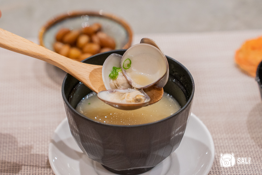 接著端上的是蛤蜊味噌湯,味噌鹹香濃郁,每一口都喝得出蛤蜊的自然鮮甜,還有幾顆飽滿彈牙的蛤蜊,用這碗作為鹹食收尾,接著就等甜點登場啦